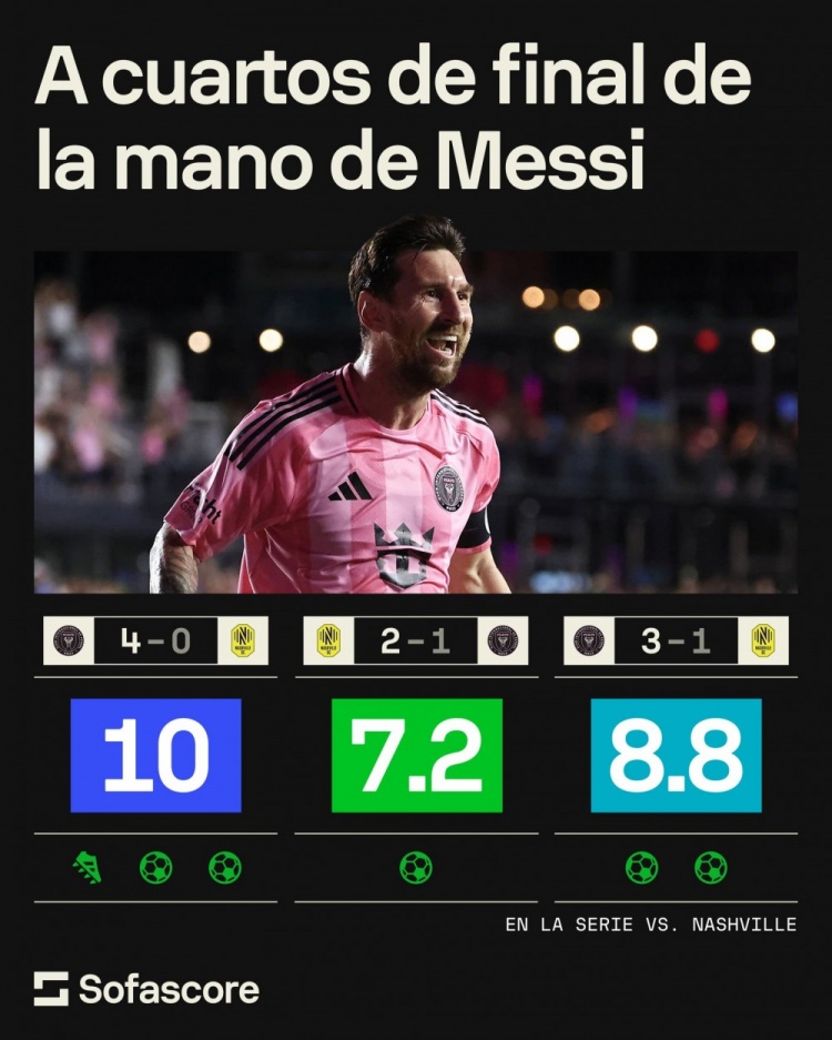 迈阿密国际3-1纳什维尔——2球,评分8.8