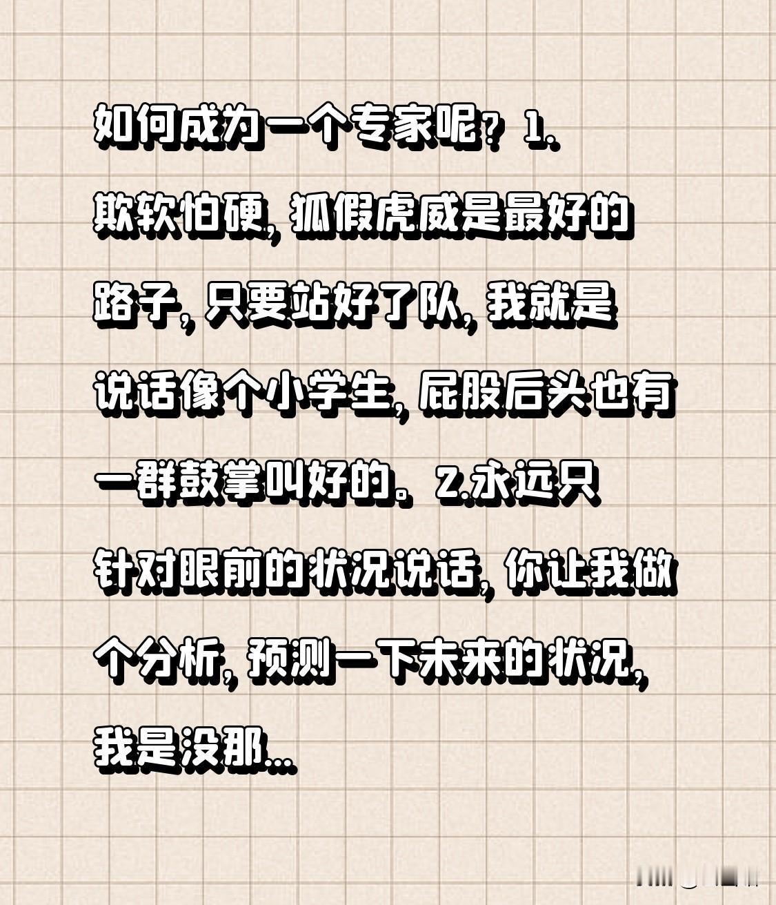 如何成为一个专家呢? 1.欺软怕硬,狐假虎威是最好的路子,只要站好了队,我就是说话像个小学生,屁股后头也有一群鼓掌叫好的。 2.永远只针对眼前的状况说话,你让我做个分析,预测一下未来的状况,我是没那个本事的。你觉得未来能剩下那几个汽车品牌:你等一下啊,我先去看看现在排在前五销量的牌子是哪几个,那剩下的就是他们了[捂脸]。 3.网上谁的声音大,我就支持谁,我怎么想的不重要,你以为我有专业有知识有原则有判断,其实错的不是我是你们,你们以为我高大上,可我就是个要饭的。你们苛责我,是你们的问题,不是我的,我冤枉啊[流泪][流泪][流泪]