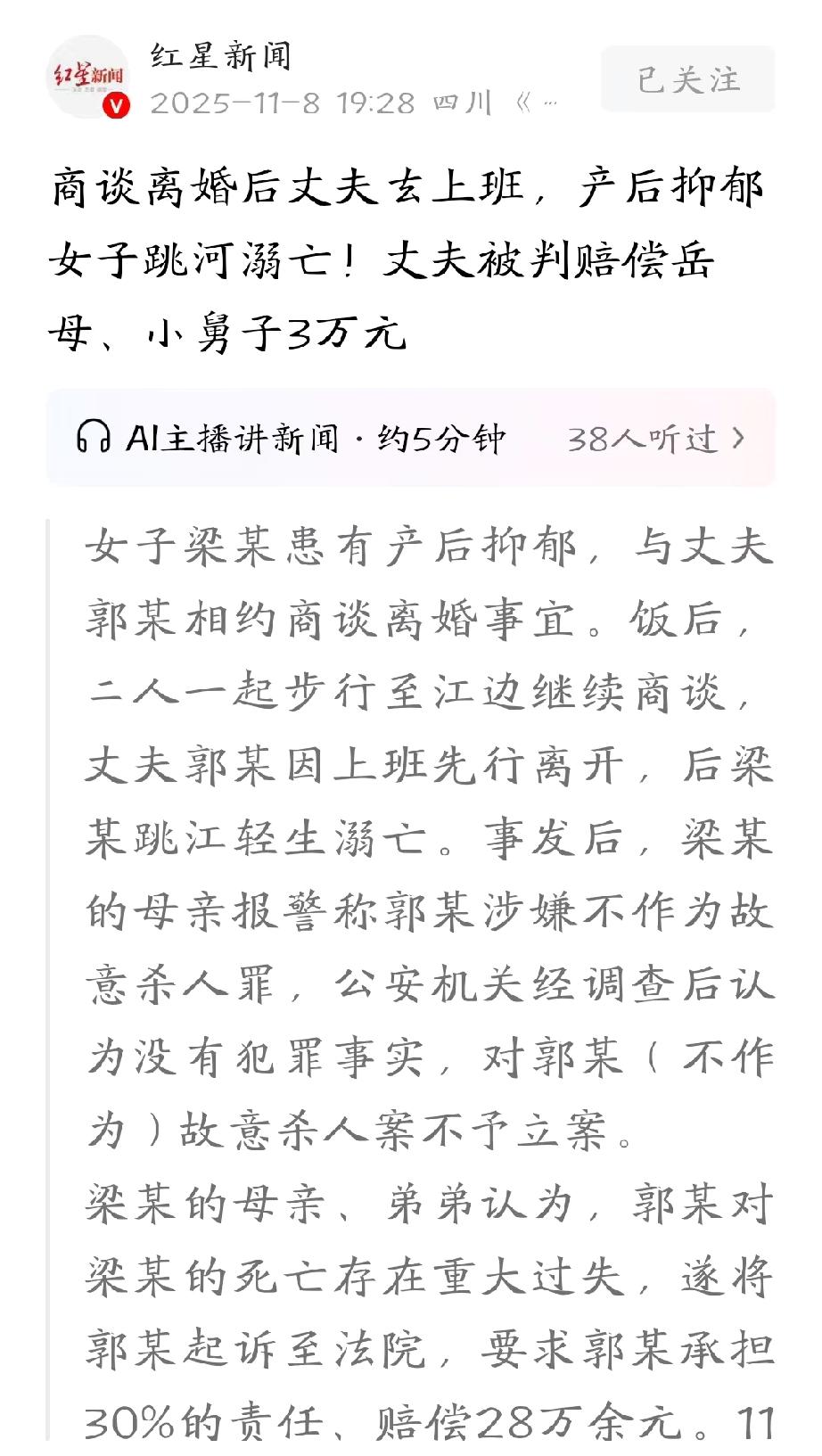 陕西安康,女子生完二胎后,患上产后抑郁,还丈夫分居生活后决定离婚。两人相约到江边商谈离婚事宜,期间再次发生争吵,丈夫没有很好的安抚女子情绪,还因为要上班,撇下女子先行离开。谁知,绝望的女子带着满腹委屈跳江轻生。事发后,女子家属悲痛欲绝,认为男子涉嫌不作为故意杀人罪,马上报案,但警方不予立案。女子家属没有放弃,又将他告上法庭,要求赔偿28万,法院判了。 郭某和妻子梁某于2017年2月15日登记结婚,婚后育有两个孩子。谁是,原本幸福的小家庭,却在老二出生后出现了裂痕。 郭某说,从妻子怀老二的时候,他们的感情就出了问题,大大小小的矛盾让他们争吵不断。 后来,郭某连吵都懒得吵了,觉得和妻子根本无话可说。生完二孩后,妻子便患上了产后抑郁。 2022年10月份,郭某和梁某分开住了,郭某住在江北,梁某带着两个孩子在机务段住,两人联系也很少。 2022年11月17日中午12点左右,郭某和梁某相约在一家餐馆商谈离婚事宜。 两人边吃边聊,气氛有些压抑,梁某心里肯定也不好受,毕竟面临婚姻的破裂,还有产后抑郁的折磨。 饭后,他们一起步行走到了汉江河边,距离汉江水边大概10米的地方继续谈。 在商谈过程中,两人又因为离婚的事产生了矛盾,情绪都不太好,郭某想着自己还要上班,便撇下梁某,先行离开了。 梁某独自一人,心里越想越委屈,产后抑郁带来的痛苦和对婚姻失败的绝望,像黑暗的深渊,看不到一丝希望,最终,她跳入了冰冷的江中。 梁某的母亲得知女儿的死讯后,悲痛欲绝,她怎么也想不明白,好好的女儿,怎么撇下两个年幼的孩子就走了。 梁某家属觉得,郭某有很大的责任,于是2023年2月,她报案称郭某涉嫌不作为故意杀人罪,请求公安机关立案侦查。 梁某的母亲和弟弟还诉称,2021年以来,郭某对梁某态度冷漠,而且持续性跟梁某争吵,还多次扬言离婚,对梁某步步紧逼。 2022年11月17日那天,两人发生激烈争吵后,郭某把梁某带到汉江边,不是好好商量,而是恶意辱骂、精神打压,导致梁某情绪崩溃。 但郭某却丝毫没有顾忌她的情绪,独自离开,这才成了压死她的最后一根稻草,所以,郭某对梁某的死亡有重大过失,应该承担赔偿责任。 而郭某则辩称,他们两个确实是商量离婚事宜,但是心平气和的,自己并没有辱骂梁某,所以对梁某的死亡不存在过错。 他也觉得委屈,自己和梁某感情不好也不是一天两天了,但自己也不知道梁某会跳江。 2023年2月28日,派出所经过侦查后,认为郭某并没有犯罪事实,所以不予立案。 梁某的家属不服,将郭某起诉至法院,要求郭某承担30%的责任,赔偿28万余元。 从法律角度看,本案的核心争议在于郭某对梁某的死亡是否负有法定救助义务以及是否存在未履行该义务的过错。 《民法典》第1059条规定:夫妻有相互扶养的义务,需要扶养的一方,在另一方不履行扶养义务时,有要求其给付扶养费的权利。 本案中,梁某患有产后抑郁,情绪易极端波动,处于需要特别关怀的特殊身心状态。 郭某作为丈夫,其扶养义务应延伸至对梁某生命安全的合理注意与救助责任,尤其是在离婚商议这一易引发情绪激化的阶段,郭某应具备高于一般情形的注意义务 。 当梁某实施跳河行为时,这种义务就转化成了法定的及时、合理救助义务。 但是,虽然郭某和妻子因为离婚事宜发生了不快,但没有证据能证实郭某目睹或者知晓妻子梁某跳河。 所以,郭某没有采取阻止跳河、呼喊救援、下水施救等合理且必要的救助措施,不能认定他未履行救助义务存在主观过错。 梁某作为完全民事行为能力人,跳河行为是她自主选择的,是导致死亡结果发生的直接原因,她应该自行承担主要责任。 不过,法院也指出,在郭某夫妻感情出现问题时,郭某明知妻子梁某患有产后抑郁,却采取离家出走这种冷暴力的方式处置问题,这确实不妥。 郭某作为配偶,对妻子梁某的心理状态及行为风险具有更强的预判能力,他没及时干预把妻子带离河边,客观上错失了避免损害结果发生的可能。 根据《民法典》第1165条第一款:行为人因过错侵害他人民事权益造成损害的,应当承担侵权责任。 综上,法院酌情判决:郭某赔偿梁某的母亲、弟弟精神抚慰金等各项损失3万元。 郭某和梁某的悲剧给大家一个警示,夫妻相处,别用沉默和冷战伤人。有时候一句话、一个拥抱,可能就救了一个家。