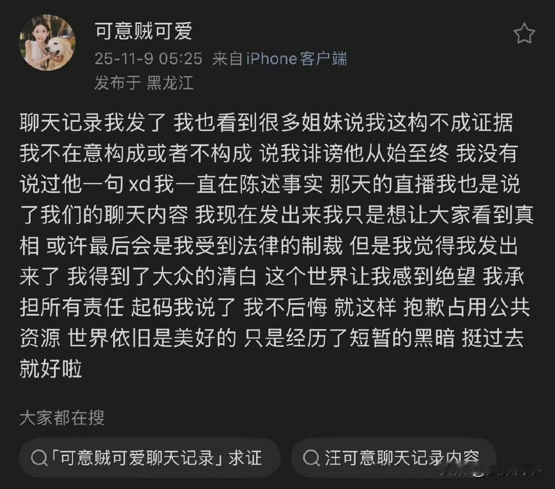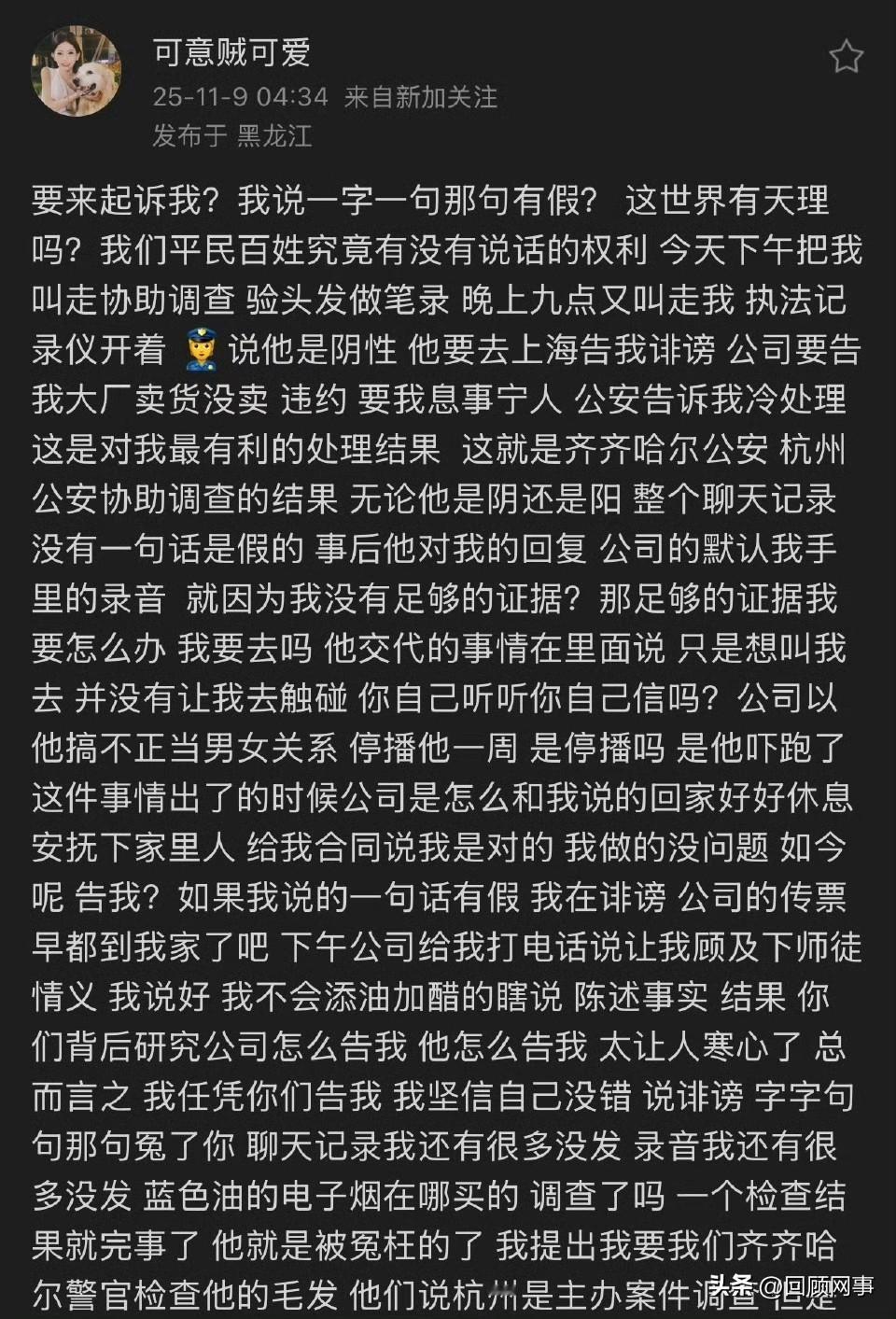 可意妹妹发文控诉716团队黑暗! 辛洋检验结果是阴性,他要去上海告我诽谤,公司告我违约,要我息事宁人,公安告诉我冷处理这是对我最有利的处理结果。聊天记录没有一句假的,公司以他搞不正当男女关系,停播他一周,他是停播了吗?是吓跑了,事情出的时候,公司让我回家好好休息,给我合同说我是对的,如今要告我,如果我说一句假话,公司的传票早就到我家了吧。 在职场我这种无权无势的人就是任人宰割,继续回到那个黑暗的公司,每天见到这人面兽心的人,如果解决不了就s,这个世界我真的够了。 他交代的事情在里面说,只是想叫我去,并没有让我去触碰。你自己听听你自己信吗?我没有说过他一句吸毒,我一直在陈述事实,那天的直播我也是说了我们的聊天内容,我现在发出来只是让大家看到真相。