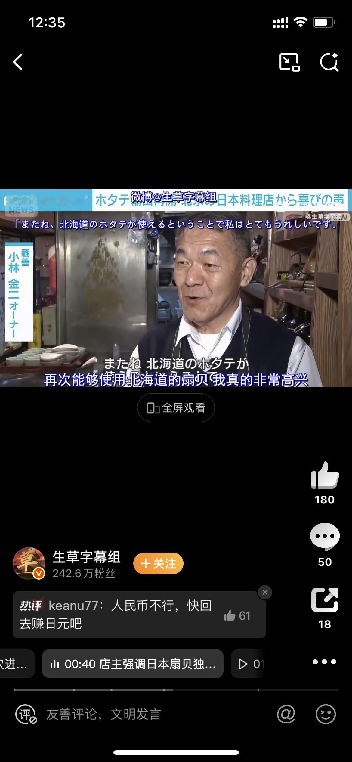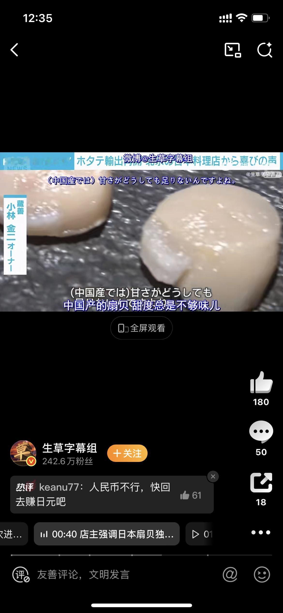 恢复进口日本扇贝后,在北京的日本料理店老板非常开心,表示北海道的品质比中国产的品质好很多,中国产的甜度不够没有那么好吃 不管哪里产的,反正不去日本料理店吃饭就好了,省得不小心吃到核辐射的水产品,检测也不能保证百分之百安全的