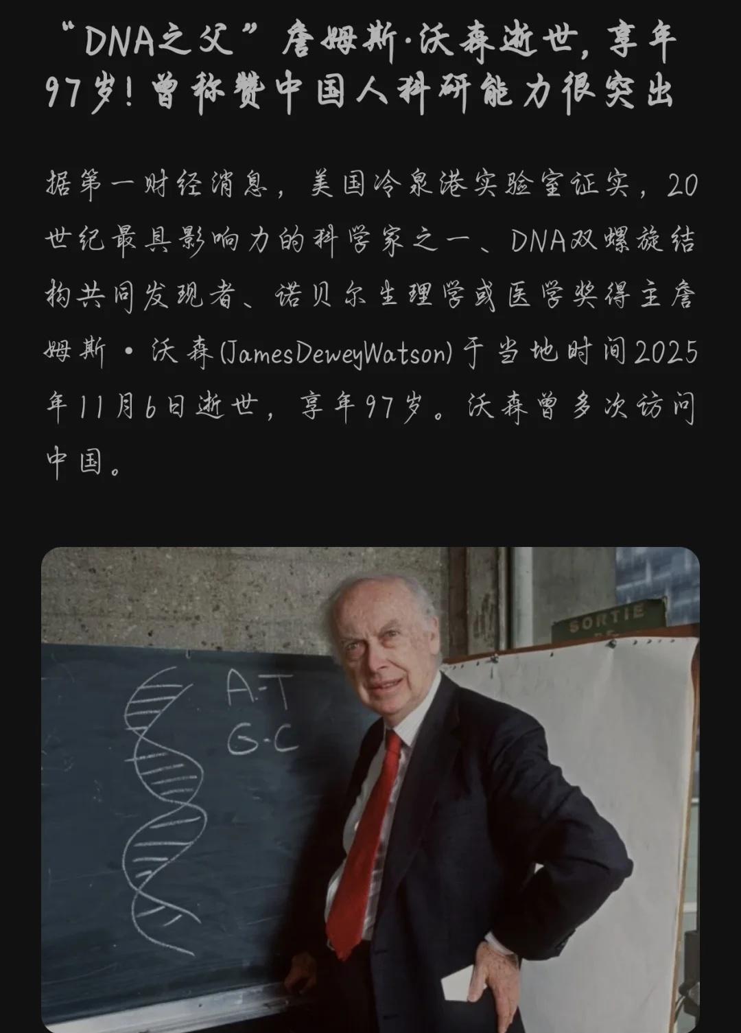 巨星陨落! 美国分子生物学家詹姆斯·杜威·沃森(JamesD.Watson