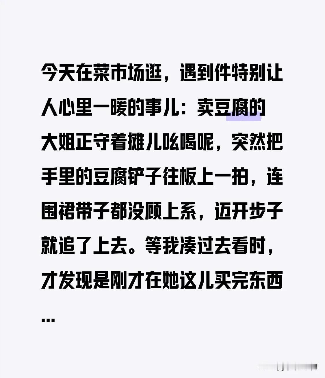 今天在菜市场逛,遇到件特别让人心里一暖的事儿:卖豆腐的大姐正守着摊儿吆喝呢,突然把手里的豆腐铲子往板上一拍,连围裙带子都没顾上系,迈开步子就追了上去。等我凑过去看时,才发现是刚才在她这儿买完东西的老太太,正低头在钱包里摸索呢,而她手里的豆腐摊儿前,孤零零落着个装药的小塑料袋。 大姐抓起那个塑料袋,追出去老远,跑了十几米才赶上,停下来的时候呼哧呼哧直喘气,赶紧喊住老人:“姨,您这降压药可不能丢在这儿啊!”老太太一听就急了,赶紧从钱包里掏出钱要给她,大姐却摆摆手,笑着说:“您下次来的时候,多买块豆腐就行啦!” 旁边卖菜的大爷凑过来说:“她呀,就爱操这份闲心,上周还帮一个迷路的小孩找到了家人呢。”谁知道大姐一听就瞪起眼,笑着说:“您家孙子上次在小区门口摔沟里,不也是我赶紧喊人捞上来的?” 说真的,现在这样热心肠的人可太少了。就像我们小区的张婶,天天把“远亲不如近邻”挂嘴边,上次楼上李叔家漏水,还是她第一个搬梯子帮忙修的屋顶呢。您身边有没有这样爱“管闲事”的热心人呢?下次再遇到这样的人,不妨多夸夸他们呀~ 豆腐 豆腐烹饪小技巧 家常豆腐 豆腐小妙招 摆摊豆腐
