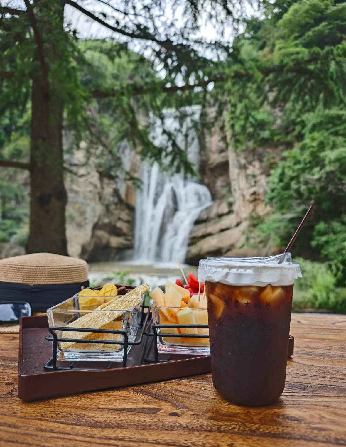 周末摸鱼摸到“瀑布咖啡馆”了!就着山涧瀑布的白噪音,往木桌前这些冰美式杯子上还印着“刘西大峡谷”,配着瓜切和脆片,风裹着树叶香往脸上扑。 草帽往旁边一扔,墨镜半挂在帽檐,抬头是溅着碎光的瀑布,低头是甜丝丝的哈密瓜浸着凉气。这哪是喝咖啡啊,是把“夏天该有的松弛”一口闷了。 手机都懒得掏,光听水声嚼脆片,脑壳里的工作早顺着瀑布流走了。建议所有打工人把“瀑布下午茶”加入人生清单,比躺平爽十倍!
