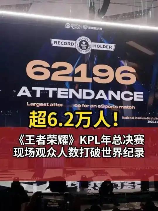 王者荣耀年度总决赛 11月8日的北京鸟巢也太炸了!王者荣耀KPL总决赛直接把62196人塞进现场,创下“最多观众单场电竞赛事”吉尼斯纪录!成都AG超玩会在2025年11月8日的王者荣耀KPL年度总决赛中以4:2战胜重庆狼队,成功蝉联冠军,并成为首支在鸟巢夺冠的中国电竞队伍。 上午12点就有人排起长队,限定徽章、纪念票夹刚上架就售罄,488到2088元的门票12秒就抢空。超85%都是跨城粉丝,有人坐十几小时绿皮火车,有人从国外转机赶来,还催生了粉丝拼房潮。 赛场里,成都AG超玩会4:2赢下重庆狼队夺冠,韩红、周深的现场演唱点燃气氛。赛场外更热闹,周边商场延长营业到凌晨,凭票根能享餐饮8.8折,电竞直接带火了北京文旅,这排面不愧是中国顶流电竞!