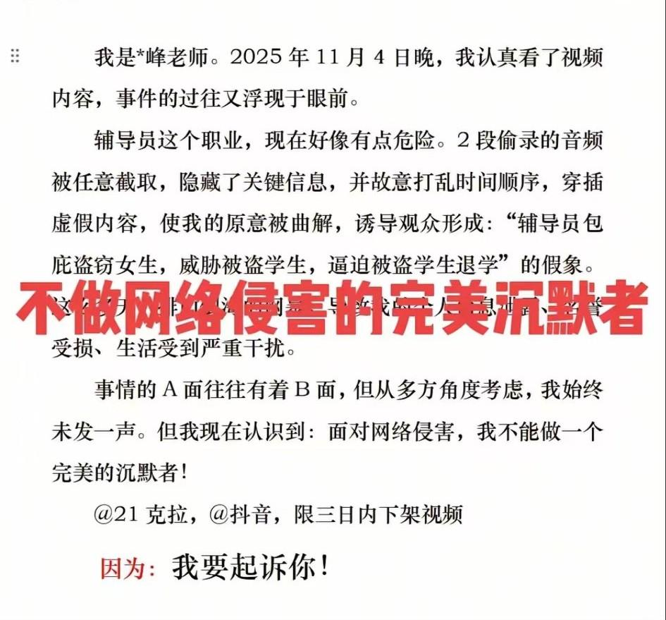 网上出现一则上海建桥学院辅导员某峰老师对4000多手表丢失事件的回应,称不再沉默,2段录音被有意截取,曲解事实,有诱导嫌疑。 面对个人信息泄露,生活被干扰,有损形象,某峰老师要起诉维权了。 至于某峰老师有没有包庇偷盗者,有没有知情不报,现在只需要等待官方结论,在结论出来之前,看客先别着急站队就好。 发这则回应贴的博主网名“带钩郎”,空间设定成“作者仅允许自己评论”。 帖子中间有一行醒目的红字,“不做网络侵害的完美沉默者”。 不管怎样,因为这件事那位大一女生申请退学,总是很可惜的一件事。 一年的学费、住宿费和生活费,可比这手表多多了。