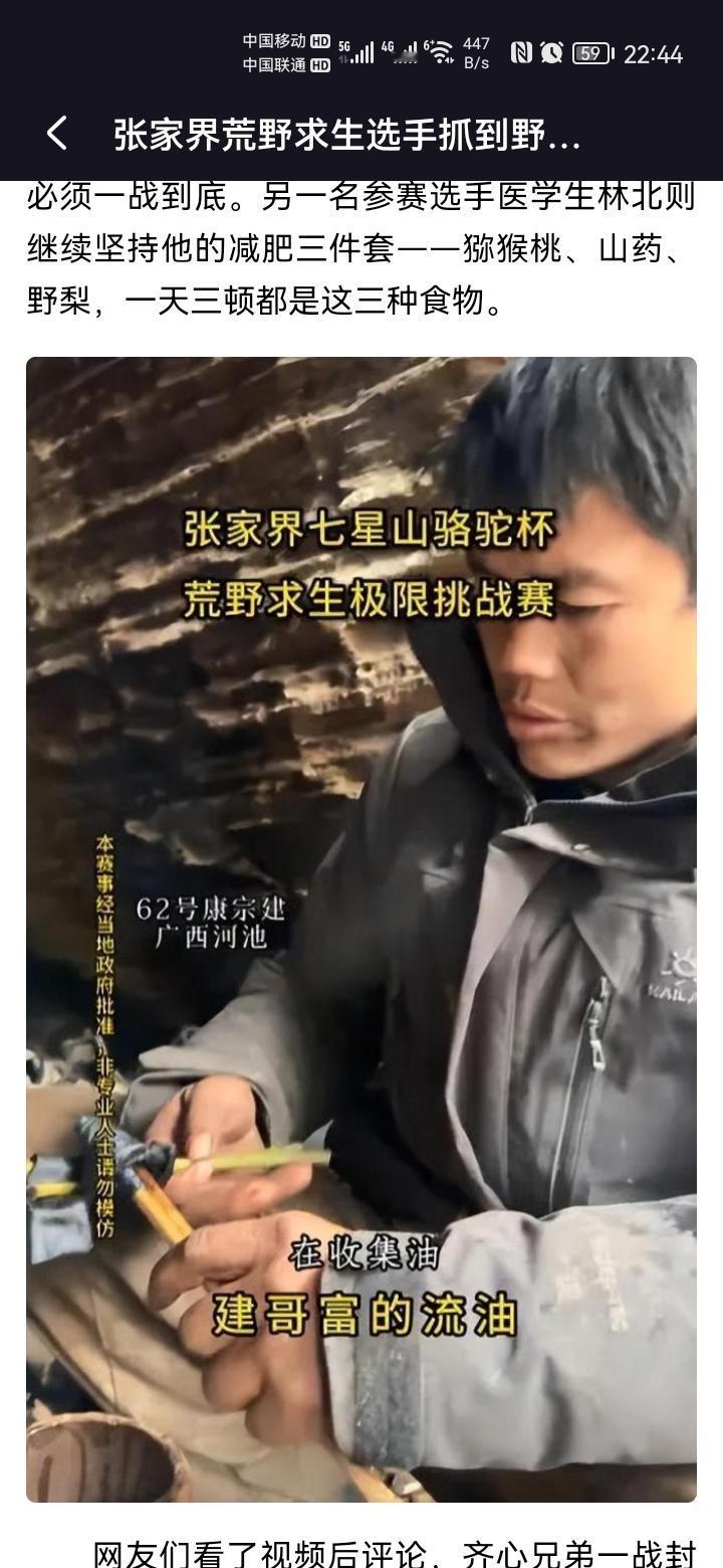 荒野求生赛场上,选手们为了生存竟吃起了野猪,这究竟是真实的挑战还是节目组的安排? 据赛事主办方介绍,这头野猪是人工驯养的二代品种,经过安全处理,旨在保障参赛选手的生存需求。 然而,这一事件也让人们开始质疑,这场生存挑战的真实性和选手们的能力是否受到了节目的干预。建弟对着镜头大口吃肉的画面让人印象深刻,而建哥则表示已经吃到不想再吃了,甚至将肥肉烤干、油脂收集起来。 参赛选手医学生林北则继续坚持他的减肥三件套——猕猴桃、山药、野梨,每天三顿都是这三种食物。这场荒野求生大赛不仅考验了选手们的生存技巧,也引发了人们对节目真实性的质疑。