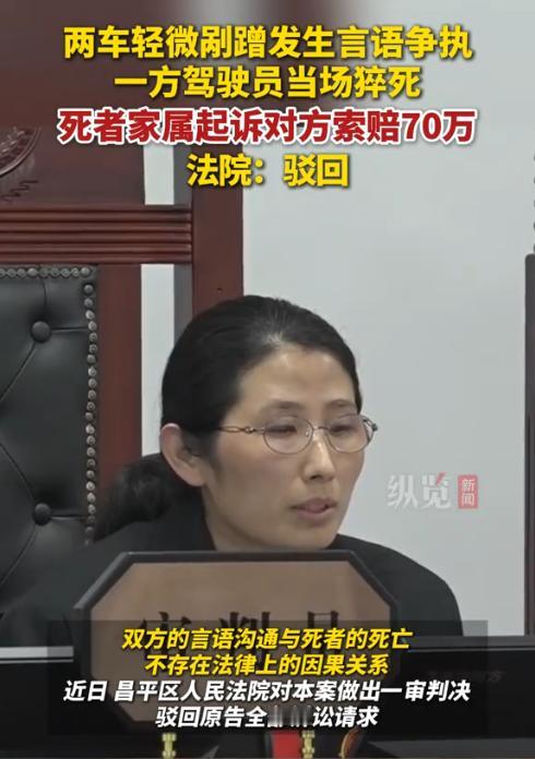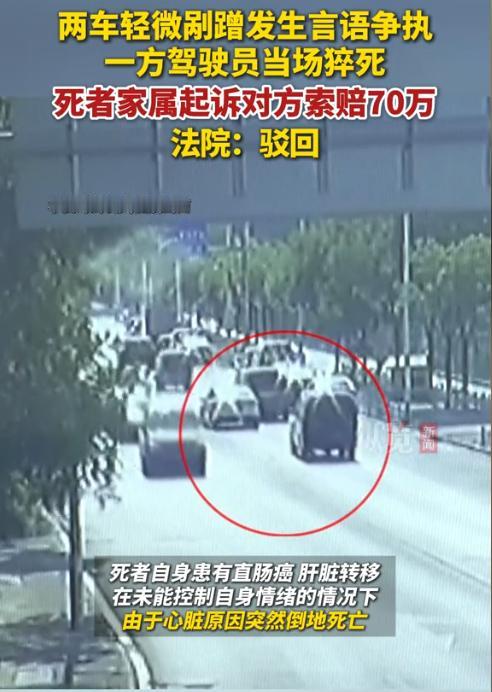 北京昌平,两辆小车发生了轻微剐蹭后,双方车主下车后就谁的责任发生了争执。谁知其中年龄大的司机突然倒在了地上,后被送到医院抢救无效死亡,死因是心源性猝死。家属认为死者被对方车主给气死了,于是将对方车主告上法院,索赔70万余元。法院判了!(来源:北京市昌平区人民法院) 事发当天下午3点半左右,李女士的56岁公公开车转弯时,与一辆直行车辆发生擦碰。直行车辆的车主张某和李女士的公公下车发生争执。 李女士的公公认为自己已经打了转向灯,而且车身已经转了大半,所以张某应当给自己让行。 但张某认为自己是直行,且并未有超速等违规行为,而交通规则中明确规定转弯必须让直行,所以李女士的公公才是违法者。 为此双方发生了一些争执,可万万没想到,就在二人争执过程中,李女士的公公突然向后倒在了地上,吓了张某和他车上的人一跳。 后救护车将李女士的公公拉到医院抢救,可到医院时,李女士的公公已经双侧瞳孔放大,心跳也没了,最终经抢救无效死亡。医院出具的诊断出显示,李女士公公患有直肠癌,肝脏转移,但死因是心源性猝死。 2025年1月份,李女士的丈夫和婆婆将张某以及同乘人员,车辆所有人、保险公司均告上了法院,要求他们承担30%的责任,共计70多万元。 面对李女士丈夫和婆婆的索赔起诉,张某一方坚决不同意赔偿,认为无法预料到李女士的公公患病,而李女士的公公死于自身疾病,更何况李女士的公公转让不让直行就是错的,不能支持谁死谁有理的不良风气。 对此,法院调查了交警队出具的《交通事故责任认定书》,发现交警队认定的是李女士公公和张某是同等责任。 理由是李女士的公公转弯未让直行,而张某则并非完全直行,他存在一个变道超车的行为,所以认定张某未确保安全行驶。 那张某和李女士公公是同等责任,是不是就代表一定要承担赔偿责任呢? 《民法典》第1165条,行为人因过错侵害他人民事权益造成损害的,应当承担侵权责任。 简单来说,就是如果张某存在过错,且该过错与李女士公公的死具有因果关系,那张某就该赔偿了。 法院经审理后认为,李女士的公公和张某在发生交通事故后,仅仅是下车沟通辩论了几句,内容也都是与交通规则有关,并没有出现肢体冲突、辱骂等行为。 因此,张某和李女士公公的行为并没有超过必要的限度。 其次,李女士的公公本身就患有疾病。 李女士的公公患有直肠癌且肝脏转移,他应当知道自己不能太过激动,要注意控制自己的情绪,可他并未控制好情绪。 张某并不知道李女士公公患有疾病,他也没有故意去刺激李女士的公公,所以张某的过错与李女士公公的死亡之间并不存在因果关系。 法院认为,交警队认定的同等责任仅仅代表车辆事故的责任,并不代表张某在与李女士公公的争辩过程中存在过错。 最终,法院判决驳回了李女士丈夫和婆婆的索赔请求。