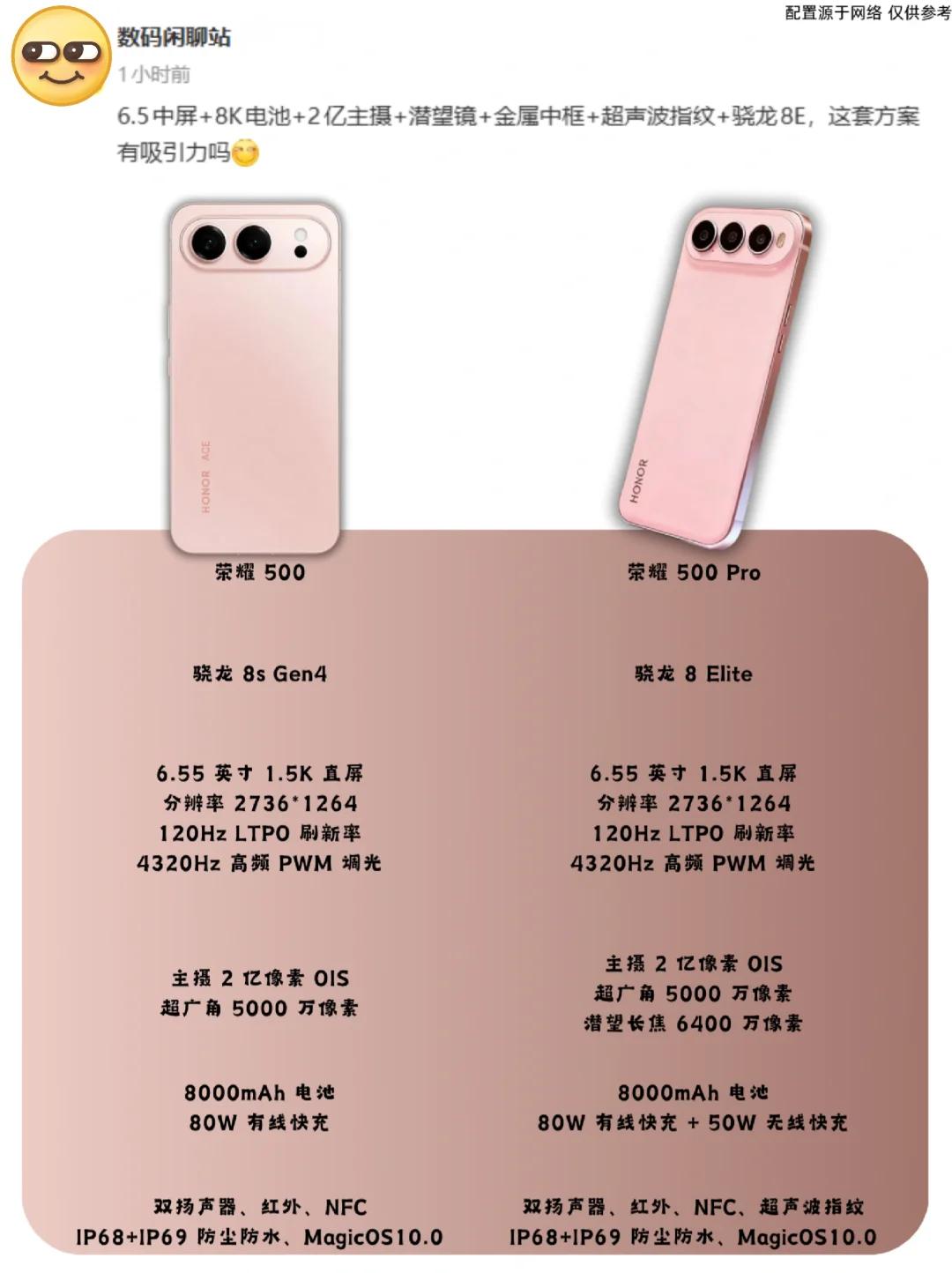 华为新机突然预售,彻底不装了,直接摊牌,处理器型号也大方公布 这周6号,没有任何宣传预热的动作,华为Mate 70 Air新机就开始了预售,真的猝不及防。另外这手机的售价是4199元,叠加补贴之后实际3699就能拿下。友商叫Air,华为也叫Air,但差距确实大 另外荣耀这边也频频爆出新机的信息,据说荣耀500系列会在这个月底发布,而且一改之前的主打拍照的策略,开始玩起性能了基本确定荣耀500标准版是骁龙8sGen4芯片,而Pro版直接上骁龙8至尊版。看来荣耀也开始玩越级套路了,标准版对标友商Pro版,Pro版则是对标Ultra旗舰 比较有意思的是,荣耀500系列会持幻影引擎3.0,换言之游戏性能不错,加上全系标配的8000mAh青海湖电池,画面太美不敢想