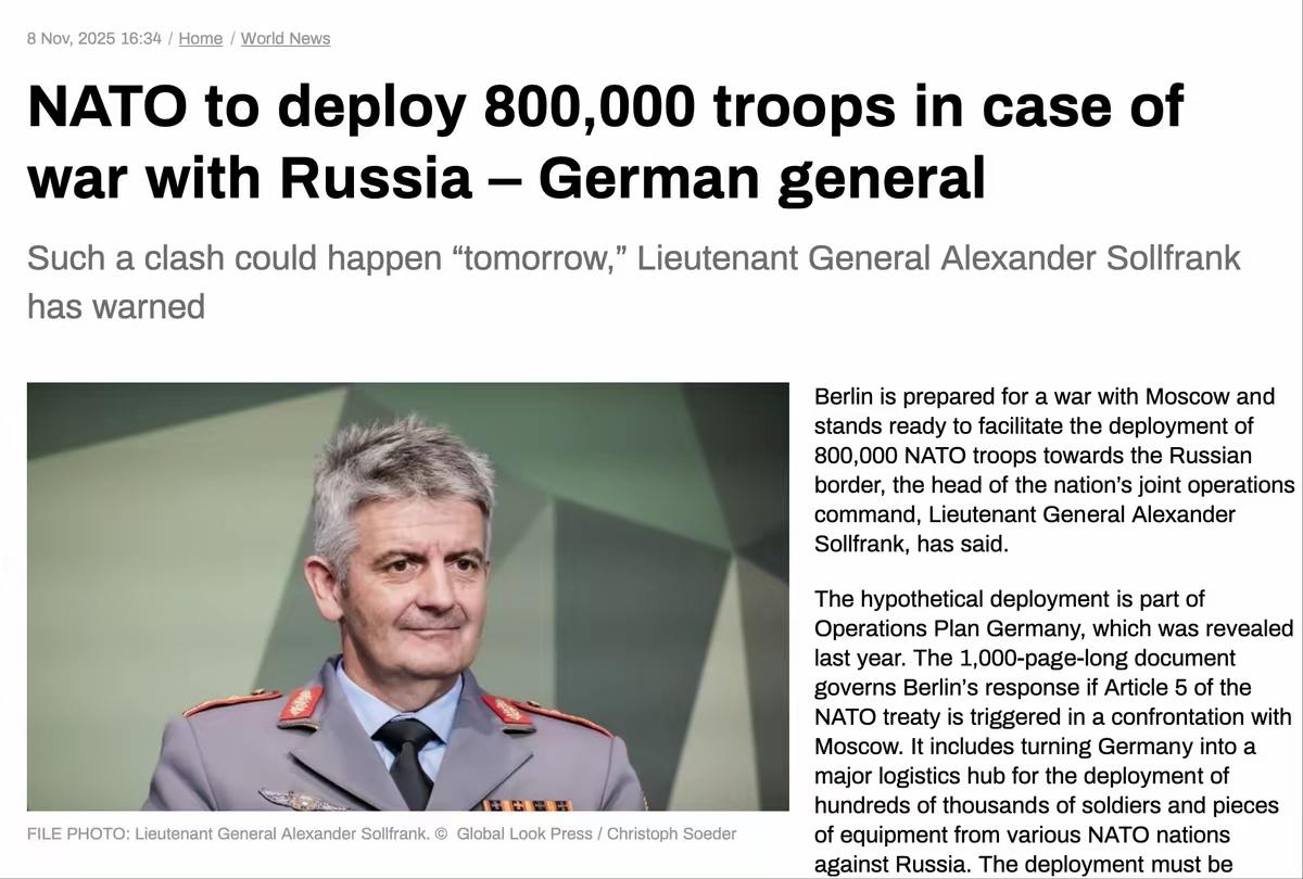 德国联邦国防军联合行动司令部司令索尔弗兰克的军事威胁言论,让俄罗斯感到非常地紧张,德国已经做好了一切的准备,德国有可能会在德国和俄罗斯边境部署80万的兵力应对战争的需要,就意味着德国将可能会向俄罗斯进行相应地战争威胁,这可让俄罗斯感到非常地紧张,当然他们不希望和德国之间开战,也有历史可以证明德国和俄罗斯战争将可能是一场艰苦而长期的战争,一旦开战损失的是双方。当然俄罗斯也不希望两国之间将可能会发生战争,但是德国已经率先开始实施军事威胁,并有可能在很短的时间内就组建好80万人的军队,这对俄罗斯来说是非常可怕的事情,一旦发生战争,俄罗斯将会面临腹背受敌,这一切尽量的去避免,人类不需要战争,俄罗斯也不需要。德国也不需要,整个欧洲环境将处于一种平稳的状态,将会是对人类最大的贡献。