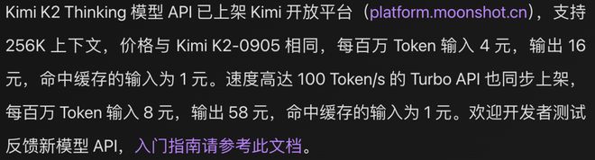 以K2Thinking为例,其官方提供的API价格是每百万输入token收费4元(命中缓存时更低至1元)、输出token16元。