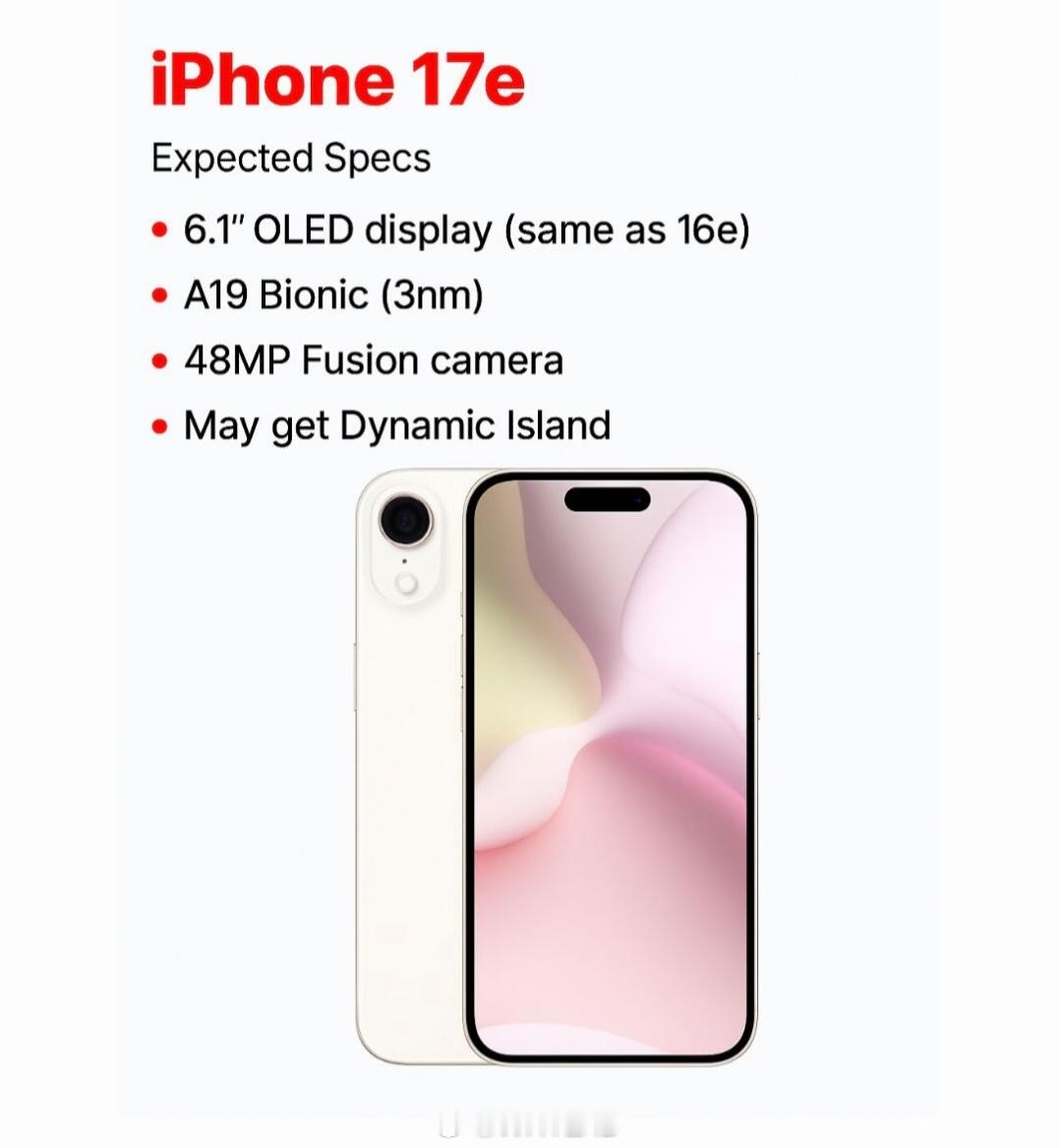 iPhone 17e 渲染图,从刘海屏换成灵动岛设计,预计明年春季发布,A19 芯片,4800 万主摄,60Hz 屏,依旧挤牙膏,还是那个果子。