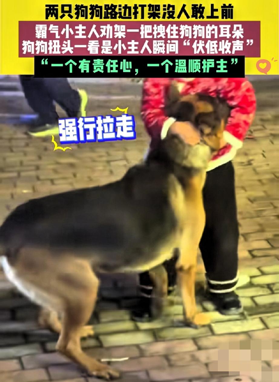 路边两只狗狗掐架吵得震天响,围观的路人里三层外三层,拍照的、议论的不少,可没一个人敢上前拉架,毕竟谁也怕被误伤。 就在场面快要失控时,一个小不点扎着羊角辫挤了进来,二话不说伸手就拽住了其中一只狗的耳朵。 神奇的是,刚才还张牙舞爪的狗狗,扭头看清是小主人,立马耷拉下尾巴,那模样活脱脱像闯了祸被抓包的熊孩子,半点脾气都没了,乖乖被小女孩拖着往家走。 都说狗狗是通人性的小精灵,这话真没说错! 它们或许不懂复杂的道理,却能精准感知主人的情绪,对小主人更是无条件顺从。 这哪里是宠物,分明是把小主人放在心尖上的家人啊。 其实温顺从不是狗狗的天性,而是对主人的信任与依赖。 你家毛孩子有没有过这种“秒怂”又暖心的瞬间?快来评论区分享一下~