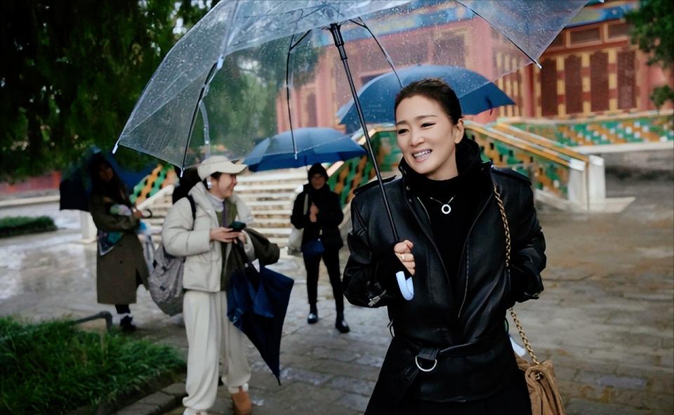 60岁巩俐这状态,真的太绝了!立冬后,北京北海公园里正飘着小雨,她穿着一件黑色皮