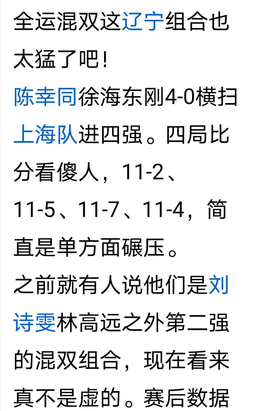 看直播比赛,细品读作品。 11月8日全运会乒乓球成年组混合双打1/8决赛。 辽宁陈幸同/徐海东3:0(11-2;11-5;11-6)零封、速胜上海陈熠/赵子豪。 晋级八强! 晋级1/4决赛! 【而不是该作品所叙的 陈幸同徐海东4:0(11-2;11-5;11-7;11-4)横扫上海队,进四强!】 详见2025-11-08 21:28 我发表的《热烈祝贺辽宁陈幸同/徐海东晋级混双八施》作品。