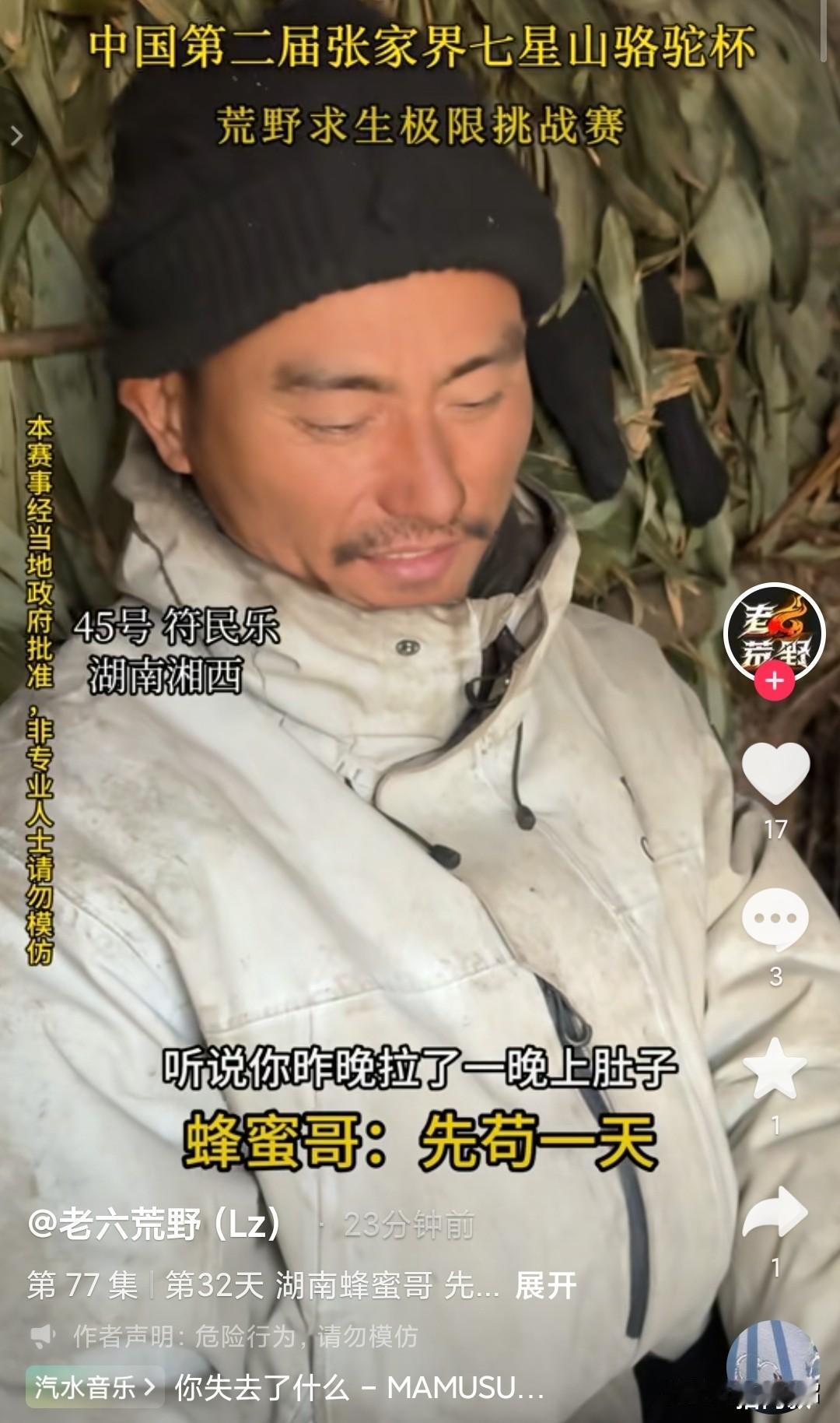 七星山·骆驼杯,93号选手杨雪,眼睛受伤退赛了,目前场上还剩下16人。 不过有之前合作的女搭档“二老板”来接他,还送了一束花给他,给他感动的要哭了,后续亲自给他上眼药水。 45号选手蜜蜂哥有退赛的风险,从8号晚上到9号中午一直在拉肚子,在没有摄入氯化钠的这种情况下,拉肚子是很难恢复的,一直拉会脱水,这是有生命危险的。 不过梨吃多了也会导致拉肚子,就看他是缺盐还是寒凉导致的,晚上吃了点草木灰止泻,后续再持续拉肚子的话,就会被医疗叫停。