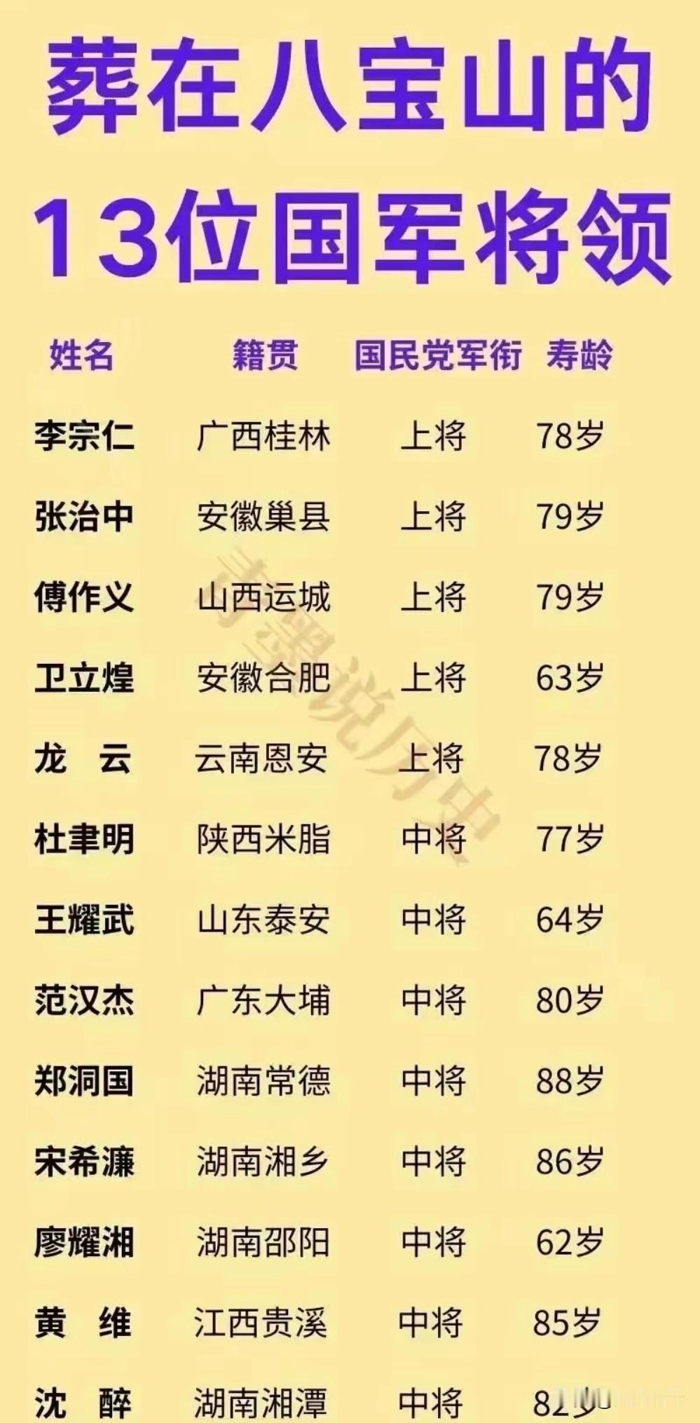 葬在八宝山的13位国军将领 李宗仁,桂系首领,民国代总统。 张治中,蒋校长的八大金刚之一。 傅作义,绥军首领,华北剿总司令。 卫立煌,蒋校长的五虎之一。 龙云,滇军首领。 杜聿明,东北保安司令,徐州剿总副司令。 王耀武,山东省主席,第二绥靖区司令官。 范汉杰,东北剿总副总司令,锦州指挥所主任。 郑洞国,东北剿总副总司令,吉林省主席。 宋希濂,华中剿总副司令,湘鄂边区绥靖公署主任。 廖耀湘,第9兵团司令。 黄维,第12兵团司令。 沈醉,国防部保密局云南站站长、中将游击司令。