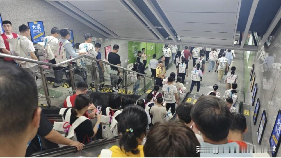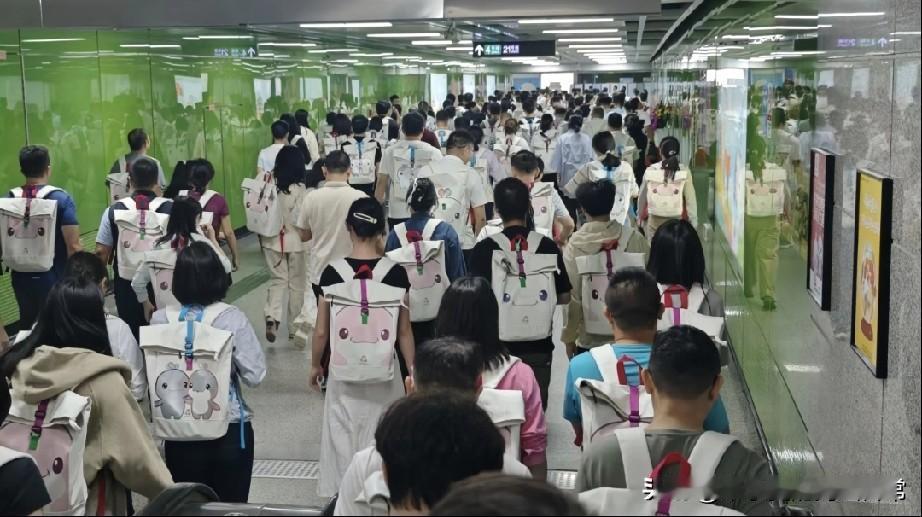广州地铁被“大湾鸡”攻陷了! 谁坐地铁见过这场面啊!一进通道直接被密密麻麻的“白包军团”撞懵——全是圆滚滚的“大湾鸡”玩偶包,粉腮红+圆眼睛,晃得我以为进了小鸡托儿所! 前面大叔的包挂着徽章,旁边妹子的包绑了彩绳,连穿西装的小哥都背着这软fufu的玩意儿,挤在绿色墙面前活像一群刚出栏的快乐崽。 地铁工作人员都看乐了:“今天站台扫一眼,全是同款后脑勺。” 有乘客举着手机拍:“这哪是坐地铁,明明是‘鸡群迁徙’现场!” 不过话说回来,这包是可爱,但几千人撞款撞得这么彻底,到底是统一美学还是没创意?你们觉得这波“全员小鸡”是走心还是单纯凑数?