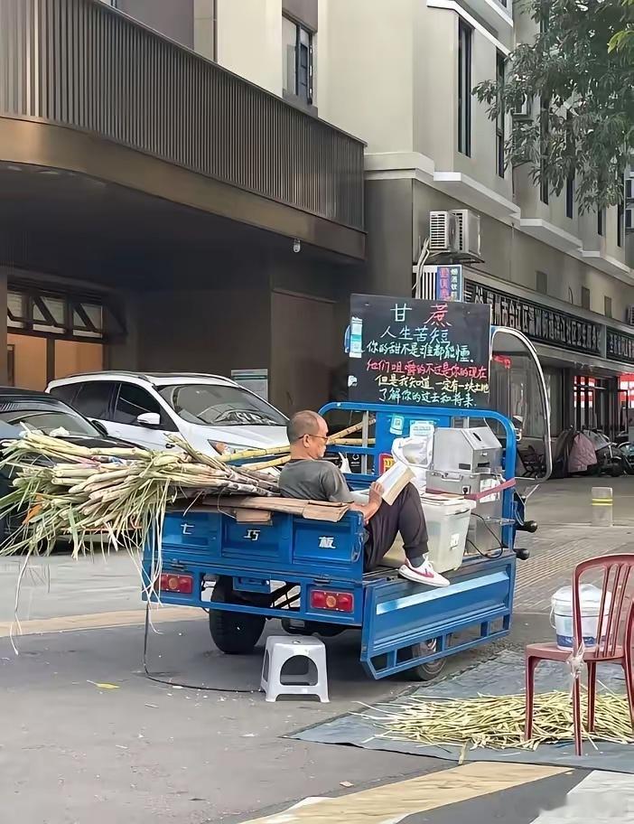 网友拍到一出售甘蔗的小贩,在没有生意的时候,安静地半躺在三轮车上看着一本厚厚的书。在三轮上挂着一小块黑板,上面的文字显示出这个商贩的与众不同。