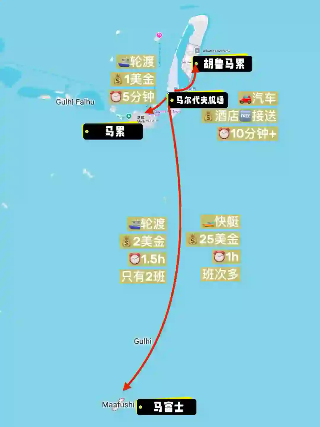 从机场到两个居民岛及马累的交通方式: