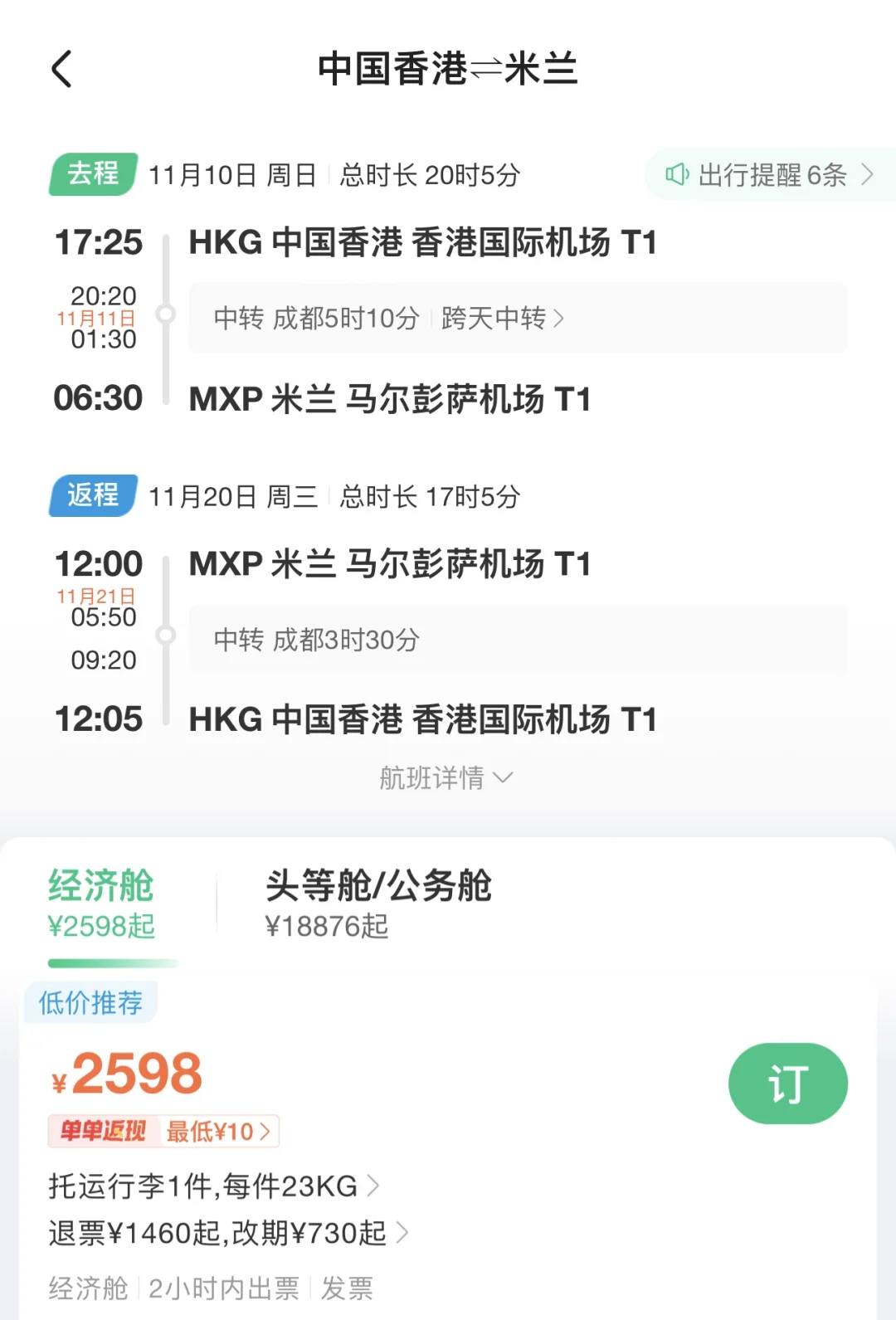 bug价机票|中国香港往返意大利含税不到2.6K