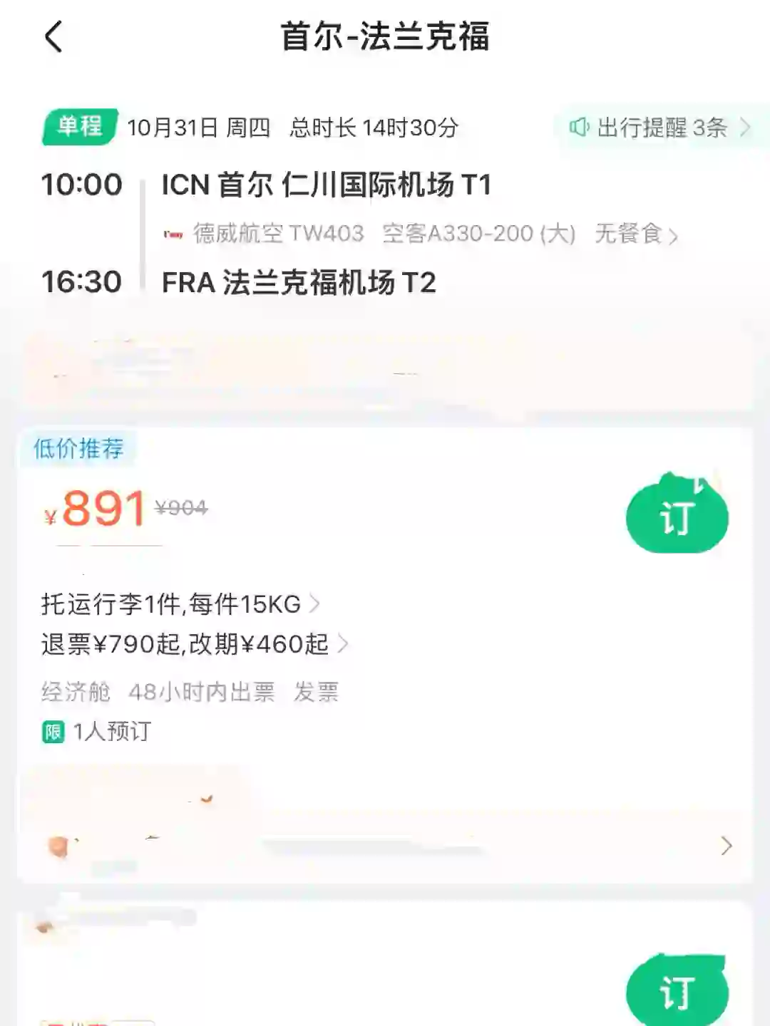1.4k飞欧洲这个价格真的不错! - 前几天给大家分享了1.4K飞肯尼亚的思路,大家很喜欢!今天给大家再来一条1.4k飞欧洲德国的方法 - 博主发现首尔飞法兰克福含税单程也只要890-1k左右!日期参考见图2-3,周围的日期也差不多! 国内大部分城市飞首尔也只要300-500!这样控制好时间!来一次1.4K穷游欧洲的计划吧! - 本博主持续利用年假环球旅行中,目前65国,定期推送旅行羊毛、机票羊毛、旅游攻略信息!如对机票有兴趣,请自行搜索! -