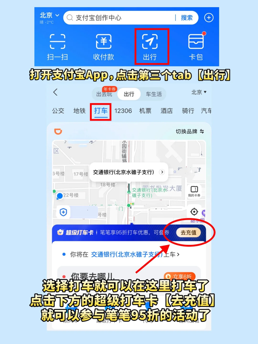 方法一:打开支付宝APP,选择第3个Tab【出行】选择【打车】,点击超级打车卡进入活动
