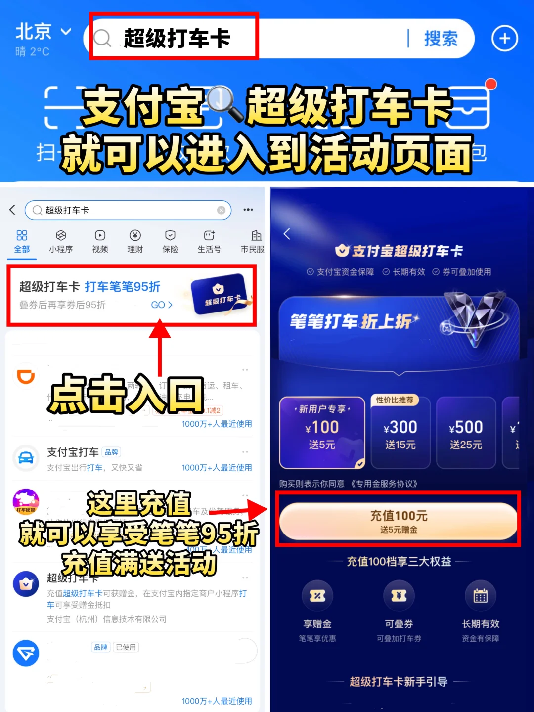 方法二:在支付宝首页搜“超级打车卡”,点击超级打车显示位置进入活动页面