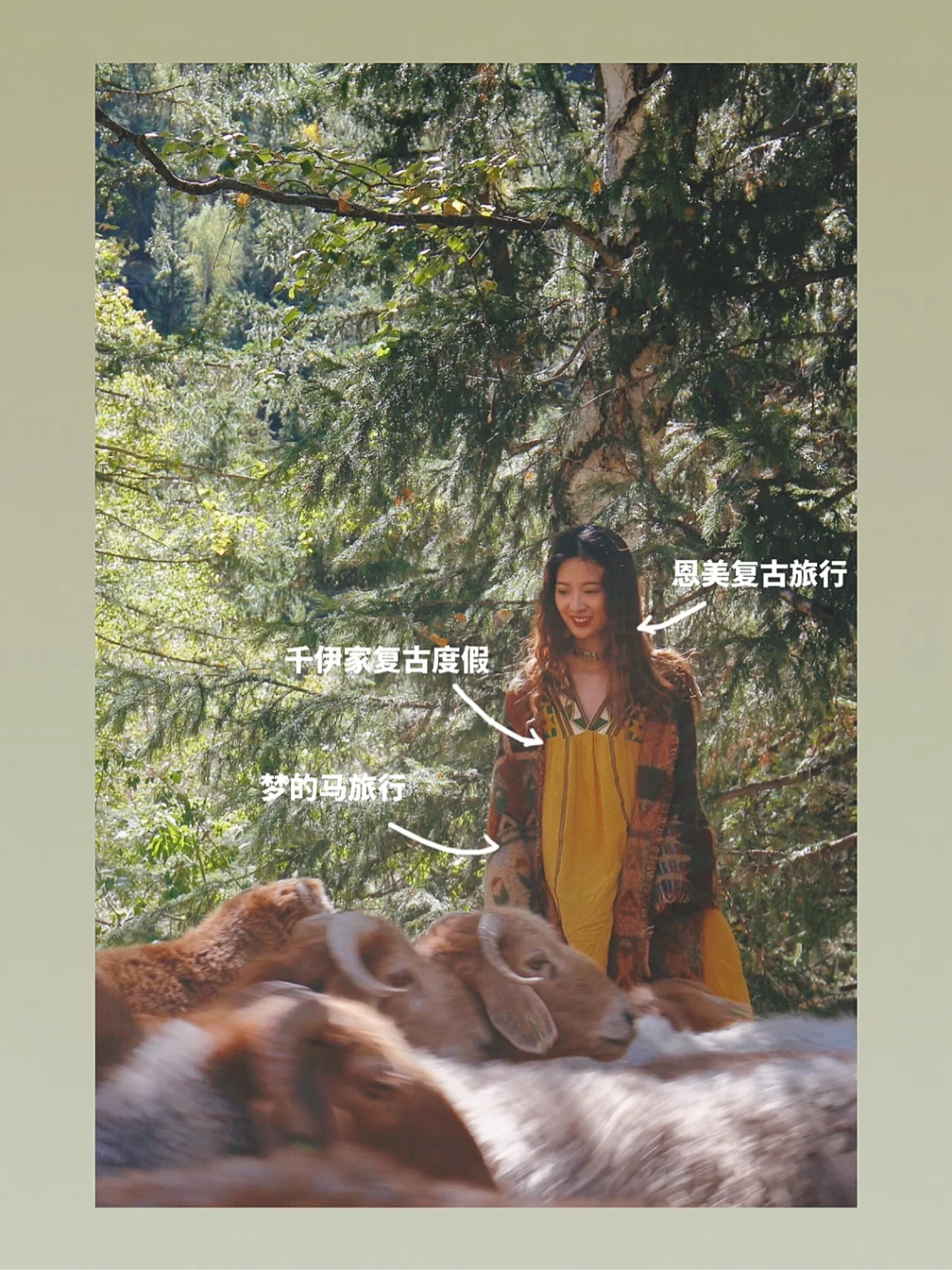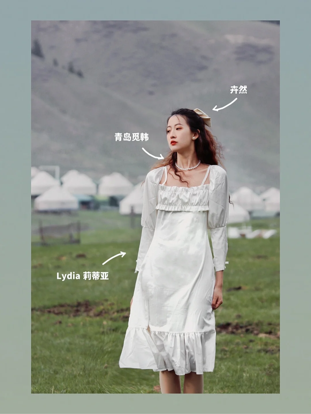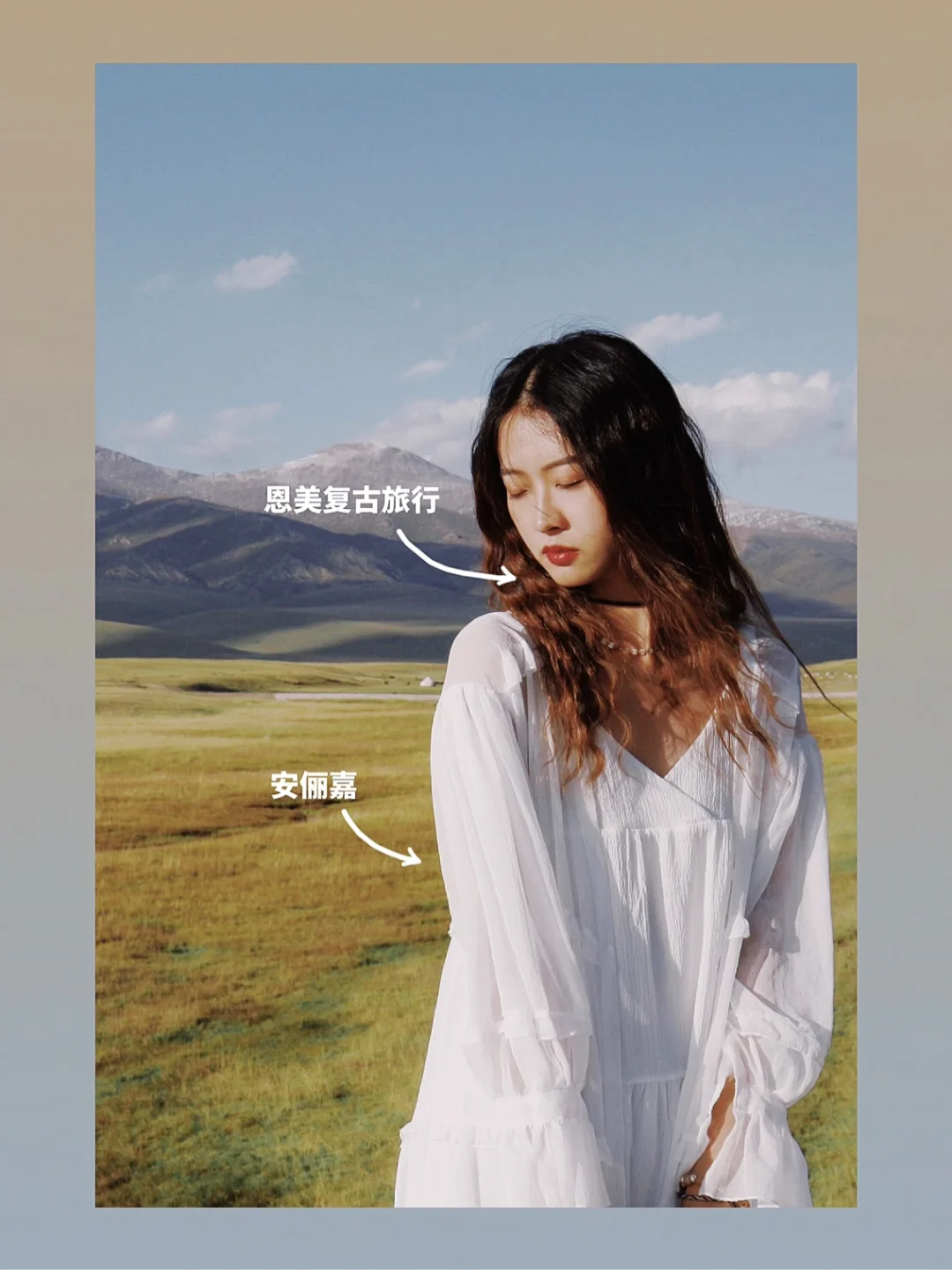 4⃣️叠穿1+1>2,无脑冲:浅色上衣+同色系马夹+同色系浅色下身(比如去伊犁这种森林,背景是绿色和蓝天,可以选择浅色上衣+浅绿色马夹+深绿色裙