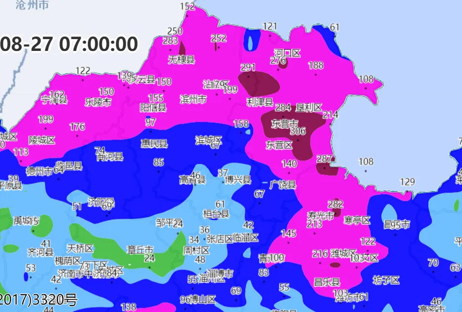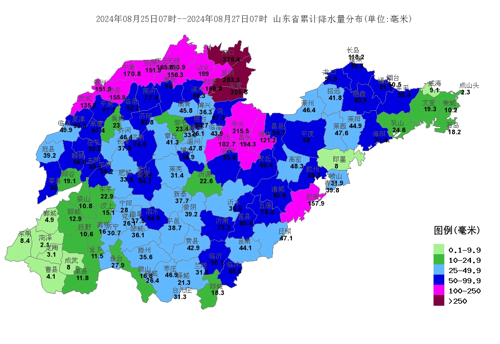 25日10时至27日10时,山东全省平均降水量为:57.7毫米,共有1981站出现降水,其中暴雨893个,大雨613个,中雨281个,小雨194个。全省最大累计降水量为401.2毫米,出现在潍坊寿光市侯镇。(完)