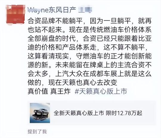 日产高层在社交平台上感慨道:如今传统燃油车的价格体系已经全面崩溃,只能跟着比亚迪的定价走。同时,他们也呼吁合资品牌不能躺平,一旦躺平就再也没站不起来,现在天籁就是真心去改变。