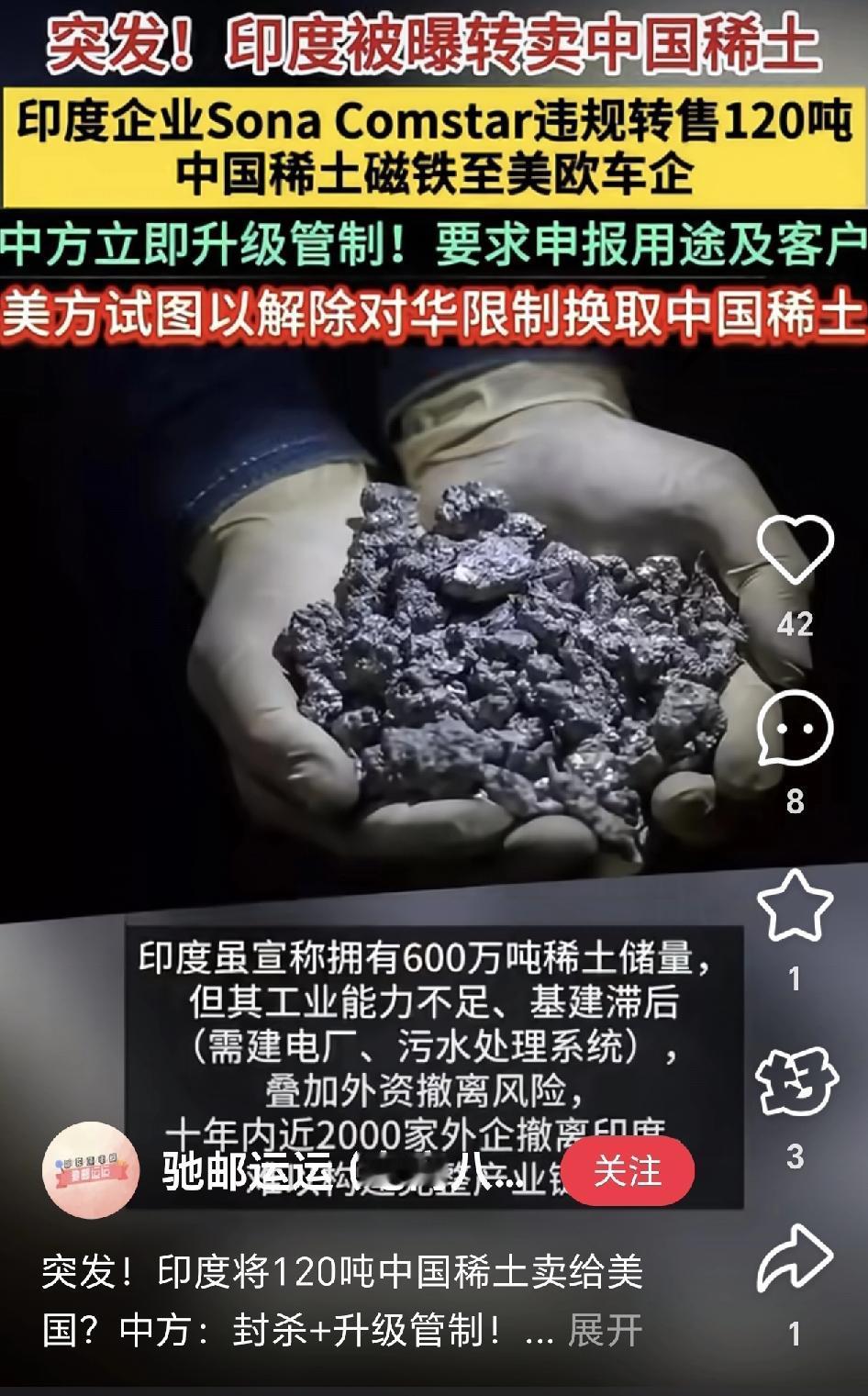 快报 快报 印度阿三 加价60%当“二道贩子” 转卖从中国进口的120吨稀土,中方反手断供让阿三日亏3亿美刀 简单说就是印度玩小聪明,最后搬起石头砸自己的脚。 印度企业想赚差价,伪造30份文件,骗中国说进口的120吨稀土是给本土电动车用的,拿到货后就转手加价60%卖给美欧,还流进了导弹、战机这些军工领域。 但中国早有准备,每批稀土都有“数字身份证”,一查就知道流向不对。直接亮剑:涉事企业终身不许买中国稀土,对印度的稀土出口全给查得严严实实。 结果呢?印度85%的稀土磁体都靠中国,断供后汽车厂停了、军工项目黄了,每天亏3亿美元;美欧自己不会精炼稀土,也没别的地方找货。 说白了,印度以为能钻空子,其实中国握着稀土精炼的核心技术,监管又严,这种“二道贩子”操作也就一次管用,最后亏的还是自己。 大家怎么看阿三这波操作,评论区聊聊?