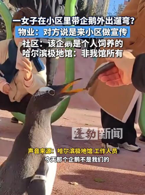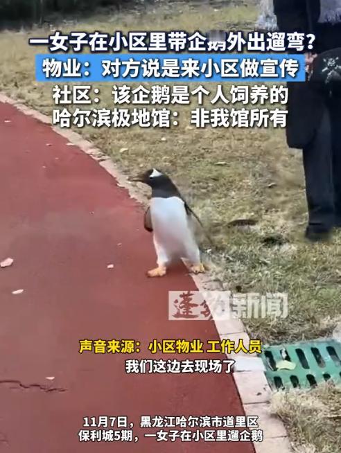 黑龙江哈尔滨,一女子在小区内遛企鹅,还口口声声说企鹅是她的个人财产,结果被其他业主拍到并上传到网上,质疑女子的身份以及企鹅的来历。事后物业公司立即撇清关系,称该女子不是业主。而社区对此表示,企鹅是野生保护动物,不可能是私人物品,女子的行为已经违法。(来源:蓬勃新闻) 有很多人好奇地去查了下《野生动物保护法》,发现上面并没有企鹅。 其实企鹅并非我国的野生保护动物,而是世界级的野生保护动物,那我国自然也要遵守保护的约定。 《野生动物保护法》第1条规定,为了保护野生动物,拯救珍贵、濒危野生动物,维护生物多样性和生态平衡,推进生态文明建设,促进人与自然和谐共生,制定本法。 由此可见,即便不是我国的保护动物,但只要成为世界级的珍贵、濒危野生动物,那就应当保护起来。 在国内,各大海洋馆都引进了企鹅作为赚钱的工具,但这些都需要有相关部门的批准。由于个人无法提供相应的极地环境给企鹅,所以个人一般是无法饲养企鹅的。 视频中女子称企鹅是她自己的,那女子的行为显然构成违法。 野生动物保护部门可以对女子进行调查,查清企鹅的来源,最后要么放归自然,要么放在就近的海洋馆。 如果这只企鹅是女子从境外引进的,那么女子还将面临5万元~50万元的罚款,严重的甚至可以追究其刑事责任。 目前,社区已经调查了一些事实,女子并非涉事小区的居民,她带企鹅到小区就是为了宣传一下,至于企鹅的来源,尚不清楚。 最后,希望警方以及野生动物保护组织立即介入调查下,即便为了宣传,也不能说是企鹅是私人的呀,这会引起误解。 对此,您怎么看?欢迎留言交流。