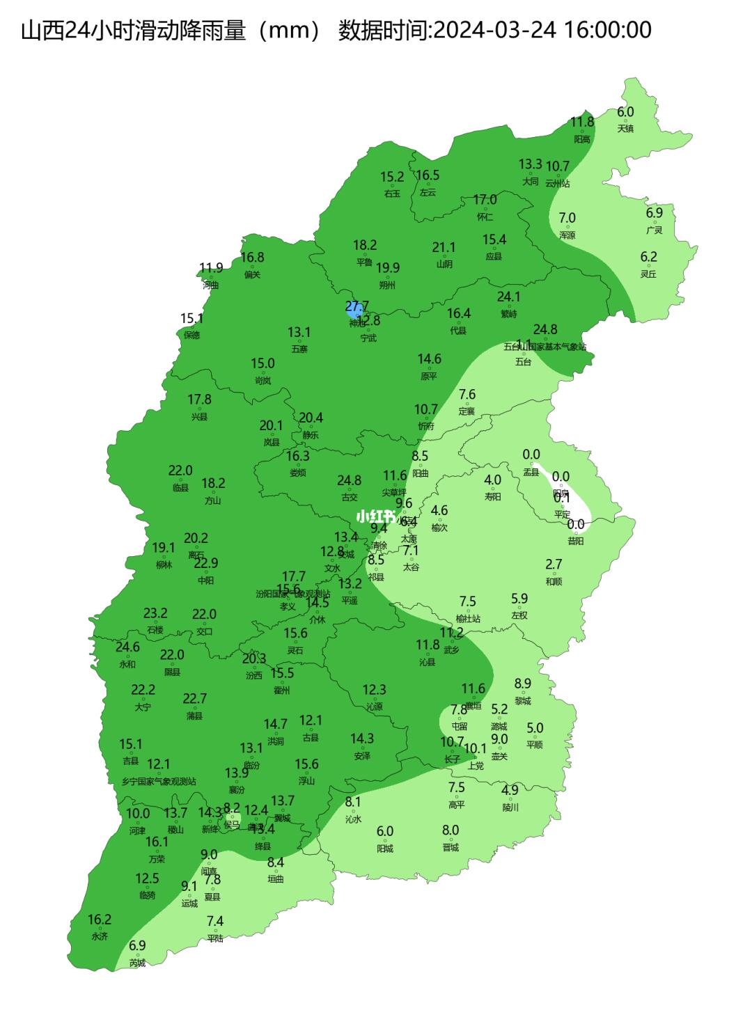 今天白天,受西风槽和低空湿润气流的共同影响,山西大部地区出现明显降水。中部和北部地区出现分散性的雨夹雪或中到大雪,南部地区以降雨为主,整体强度比较大,中部和西部地区累计降水量普遍在10毫米以上,神池站更是达到27.7毫米。