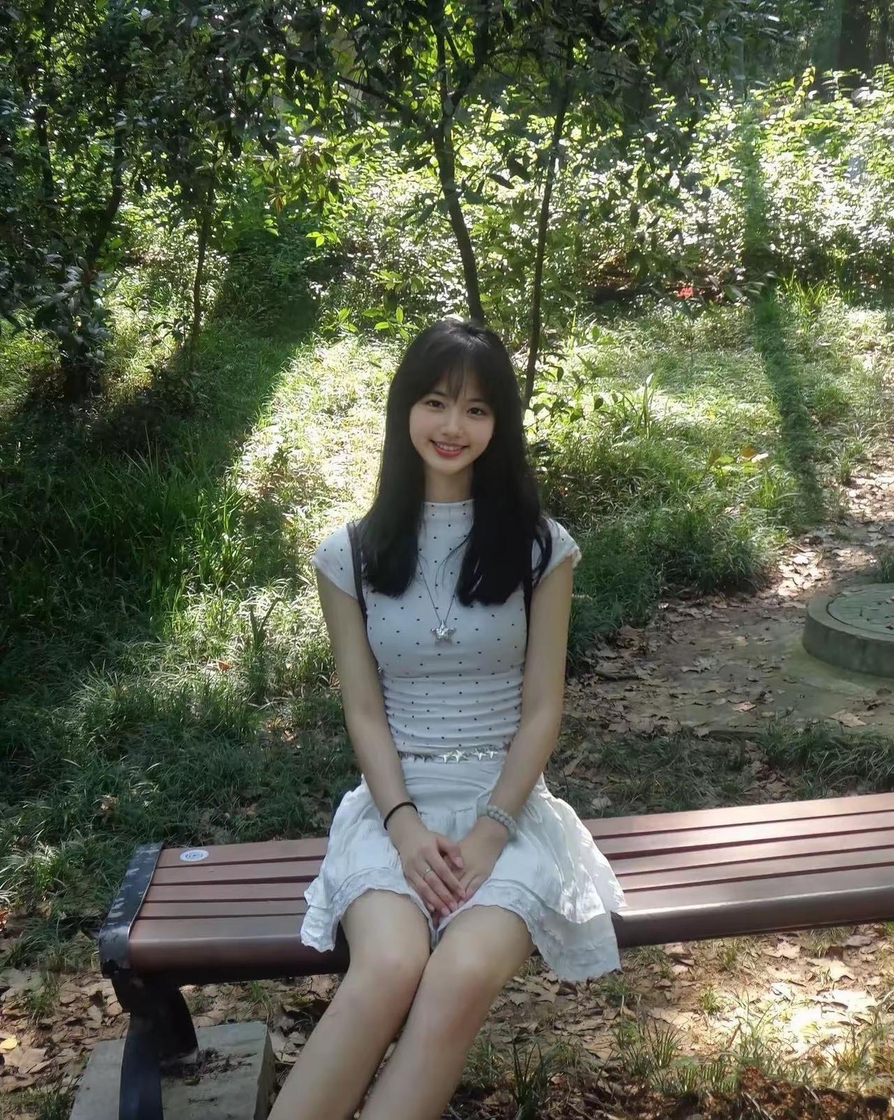 树荫把夏天的热意都揉软了,连风都带着草木的香~今天是和自然贴贴的“清新系穿搭”,长椅上的光斑都在为这张笑脸加分✨