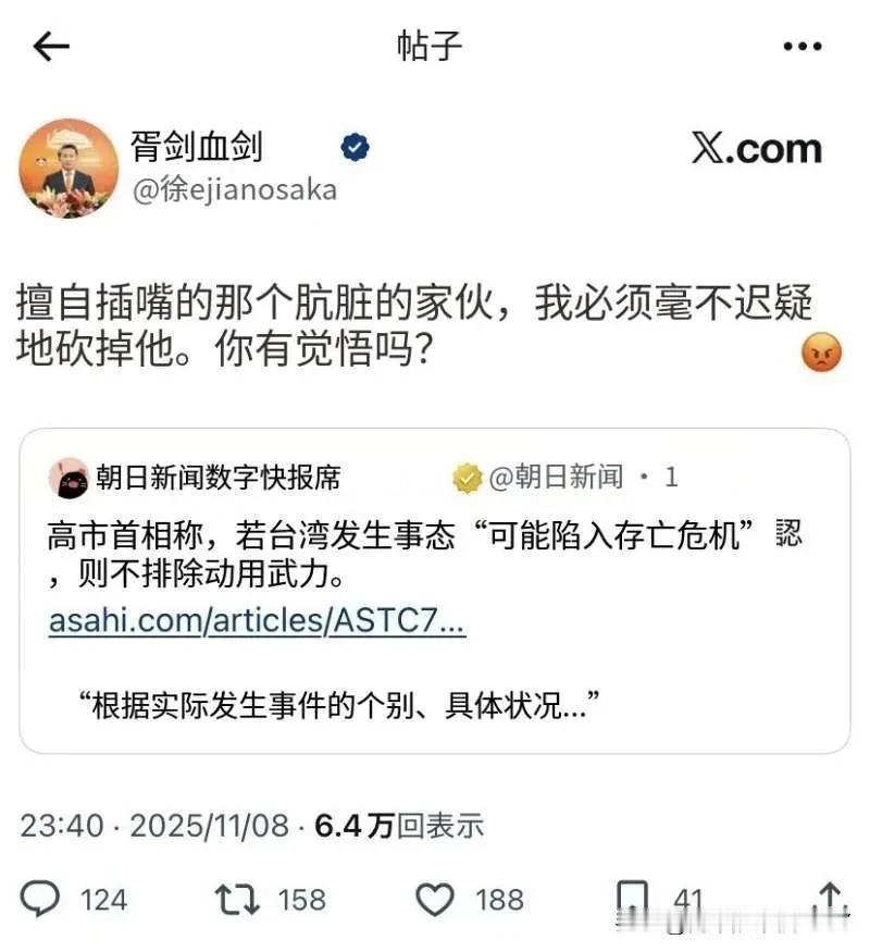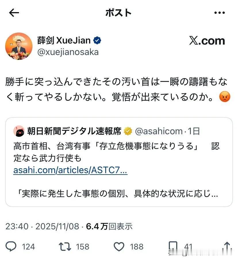 中国驻大阪总领事薛剑11月8日晚在社交平台X上发表的言论,引发日本国内舆论哗然。 日本首相高市早苗11月7日在日本国会众议院表示:“若台湾有事,可能构成日本的存亡危机,则不排除动用武力。”薛剑总领事对此评论:“只能毫不犹豫地斩掉那擅自闯入的肮脏头颅。你已经做好心理准备了吗?” 一时间,日本网民的反应堪称激烈到失态。有人嘶吼着“外交官扬言砍下日本首相的头,这已是对主权国家宣战了”,有人气急败坏要求“这位外交官应该被驱逐出境”,更有甚者夸大其词声称“这个人在日本已经构成了对日本安全的威胁了”。 这些跳脚式的抗议看似来势汹汹,实则暴露了内心的极度心虚与理亏。难道日本政客公然践踏Z国主权、干涉Z国内政时,就没想过会遭到强烈反击?难道只有日本可以肆意挑衅,Z国连正当回应的权利都没有?这样的双重标准,未免太过荒谬。 T湾是Z国领土不可分割的一部分,这是国际社会公认的事实,是载入联合国宪章的国际法准则,更是中日四个政治文件明确规定的核心内容。T湾问题纯属Z国内政,任何外部势力都无权干涉,这是底线中的底线,红线中的红线。 高市早苗作为日本首相,理应深知这一基本常识与外交规矩,却偏偏选择铤而走险,在国会这一正式场合抛出“T湾有事即日本有事”的危险论调,甚至公然叫嚣“不排除动用武力”。 这种言论绝非无心之失,而是蓄意挑衅,是对主权的严重侵犯,是对中日关系政治基础的公然破坏,其性质之恶劣、影响之严重,令人发指。更值得警惕的是,高市早苗的涉台妄言并非孤立行为。 此前的10月31日至11月1日,她便在社交媒体上连续发布APEC会议期间与T湾当局人员会面的消息,不仅配发照片,还公然称对方为T“总统府资政”,明目张胆地为“T独”势力站台,向其释放严重错误信号。 这种在国际场合高调炒作涉台议题、违背一个中国原则的行径,已经突破了外交底线,严重伤害了Z国人民的感情。日本在T湾问题上本就负有不可推卸的历史罪责,曾长期殖民台湾的黑暗历史,至今仍是Z国人民心中难以磨灭的伤痛。 今年恰逢Z国人民抗日战争暨世界反法西斯战争胜利80周年,也是T湾光复80周年,在这样特殊的历史节点,日本政客非但不深刻反思历史,反而变本加厉地妄图干涉Z湾事务,其用心何其险恶? 作为战败国,日本本应恪守二战后形成的国际秩序,遵守和平宪法,放弃军国主义野心,在涉及他国主权的问题上谨言慎行。但现实却是,日本近年来不断突破和平宪法限制,大幅增加国防预算,扩充军事力量,频频与他国开展军事演习,其军国主义复活的苗头日益明显。 而干涉T湾事务,正是其推行地区霸权野心的重要一步。高市早苗之流不断渲染“T湾有事就是日本有事”,本质上是想将T湾问题国际化。这种打着重构地区安全秩序的幌子,行干涉他国内政之实的做法,不仅严重破坏T海和平稳定,也给地区安全局势带来巨大风险。 面对日本的无理挑衅,薛剑总领事的强硬回应堪称大快人心,既合理合法,又彰显了Z国捍卫国家主权的坚定决心。“朋友来了有好酒,豺狼来了有猎枪”,Z国向来以和为贵,但这并不意味着Z国会容忍任何国家的肆意挑衅。 日本网民的激烈反应,不过是无理取闹的自我表演。他们选择性忽视本国首相的挑衅言行,却对我们外交官的正当回应横加指责,这种本末倒置的做法根本站不住脚。在国际交往中,相互尊重是基本准则,任何国家都不能将自己的意志强加于人,更不能肆意侵犯他国主权。 当前,T海和平稳定的最大威胁来自“T独”分裂势力和外部干涉势力。“T独”分裂行径与外部干涉势力相互勾结,是台海局势紧张动荡的根源。日本作为地区国家,本应秉持客观公正立场,尊重Z国主权和领土完整,遵守一个Z国原则,为T海和平稳定发挥建设性作用。 但遗憾的是,日本却选择站在历史错误的一边,不断与“T独”分裂势力勾连,频频发出涉T错误言论,这无疑是在加剧T海局势紧张,损害地区和平稳定。Z国捍卫国家主权和领土完整的决心坚如磐石,意志不可动摇。 无论是过去、现在还是将来,Z国都绝不允许任何国家以任何方式干涉T湾事务,绝不允许任何分裂国家的行径得逞。“犯我中华者,虽远必诛”,这不是一句空洞的口号,而是中国人民用鲜血和生命捍卫国家主权的坚定誓言。 日本莫要错判形势,误以为Z的克制是软弱可欺,误以为外部势力的支持能让其为所欲为。任何国家、任何势力都不要低估Z国人民捍卫国家主权和领土完整的决心、意志和能力。希望日本政客能够认清形势,悬崖勒马,否则必将被永远钉在历史的耻辱柱上。