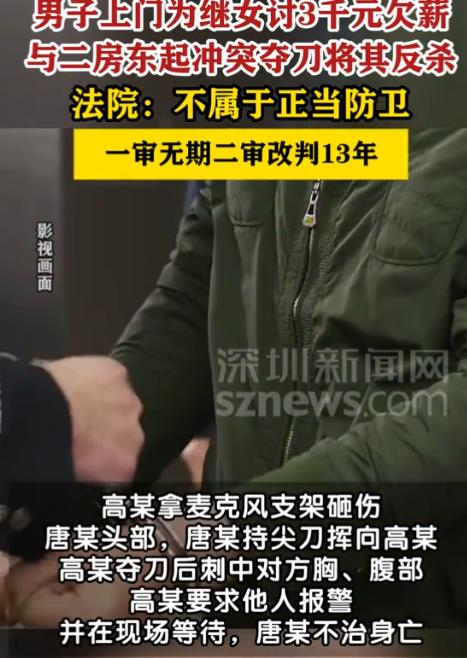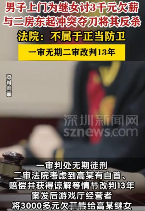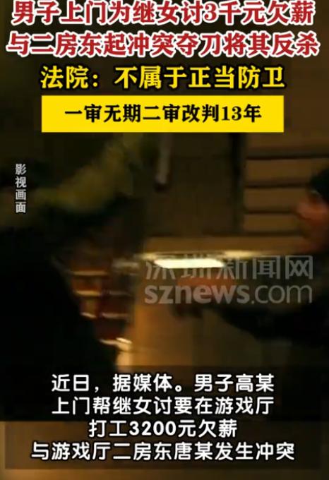河南鹤壁,一女孩在游戏厅打工1个多月,被拖欠了3200元的工资。女孩向继父哭诉后,继父气得到游戏厅找老板讨说法,期间二人发生肢体冲突。男子先用麦克风支架砸伤了老板的头部,随后老板持刀挥刺反击,在二人争斗期间,继父抢过老板的刀捅向老板致其死亡。一审法院认定男子构成故意伤害罪,判无期。男子不服,认为自己是正当防卫为,于是提起上诉。二审判了! 张女士(化名)怎么也想不到,自己三千来块钱的工资,会让继父把人杀了,那天游戏厅里的血迹早就清理干净,但那一天的混乱,张女士这辈子都忘不掉。 事情的起因是张女士(化名)在一家游戏厅打工已有一个多月,原本她期待着这份工作能带来稳定的收入,然而,随着时间的推移,她的工资却迟迟没有支付。 无奈之下,张女士决定向家里人寻求帮助。 她选择向自己的继父倾诉这一困境,张女士的继父得知此事后,心中充满了愤怒与不满,他知道,女儿辛辛苦苦工作一个多月,却因为老板的不诚信而被拖欠工资,这让他觉得十分不公。 随后继父就带着张女士去了游戏厅,到那之后继父刚开始孩子还在好好说话,但后来两人就发生了冲突,直接砸了老板一下。 此时老板被砸懵了,几秒钟后才反应过来,转身从柜台底下摸出一把刀,朝着继父挥过去。 张女士吓得尖叫,想拉却拉不住,继父没躲,反而冲上去抢刀,混乱中,刀到了继父手里。 接下来的一幕,让所有人都傻了眼,这个刀直接捅在了老板的身上。 紧接着老板倒在地上,血很快流了一地,继父也慌了,拉着张女士就往外跑。 可老板没救过来,当天就没了气。 警察很快就找到了继父,把他带走了。 最后经过法院的调查之后在一审的时候,法院判继父这是故意伤害,判了他无期徒刑,继父不服,说自己是自卫,上诉了。 到了二审,法院改了判,说继父虽然一开始是想自卫,但抢了刀之后把人捅死,已经超出自卫的范围了,定了过失致人死亡,判了十三年。 事后这件事情被网友们刷到了这之后,有人说,再怎么生气,也不能杀人啊,一条人命没了,再有理也变没理了,觉得继父这样的做法很亏。 此外也有一些人说老板闹成今天这样的下场就是活该,谁让他不给工资,都是打工人,应该互相理解,不应该不给工资的。 那么张女士现在悔得不行,早知道会这样,当初就算工资要不回来,也不该让继父去找老板。 那么这起案件不仅揭示了社会矛盾的激化,也反映出个体情绪失控和法律边界的复杂性,继父和老板的冲突,虽然起初源于一笔被拖欠的工资,但双方的对抗最终发展到不可收拾的局面。 最后希望通过这个案件,大家都能更加珍惜自己和他人的生命与安全,避免因一时冲动而走向无法回头的结局。 对此,你还有什么看法呢? (来源:深圳新闻网,河南省高级人民法院)