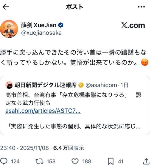中国驻大阪总领事薛剑11月8日晚在社交平台X上发表的言论,引发日本国内舆论哗然。日本首相高市早苗11月7日在日本国会众议院表示:“若台湾有事,可能构成日本的存亡危机,则不排除动用武力。”薛剑总领事对此评论:“只能毫不犹豫地斩掉那擅自闯入的肮脏头颅。你已经做好心理准备了吗?” 这句话迅速在日本网络上引爆热议,许多日本网民认为这是对外交礼仪的严重冒犯,甚至有人宣称这等同于“对主权国家宣战”。 若深入探究薛剑总领事为何选择如此直白的表达方式,需要回顾他近年来的外交风格。薛剑总领事在日本的履职过程中,逐渐形成了观点鲜明、语言犀利的独特风格,一些日本媒体曾给他贴上“战狼外交官”的标签。 但薛剑本人对此有过明确回应,他表示:“我不认为自己是战狼外交官。如果真要用这种说法的话,我们中国外交官不是狼,反而是与狼作斗争的外交官”。这种外交风格的转变,反映了中国外交整体上更加自信、主动的姿态。 薛剑总领事在之前的多次访谈中阐述过他的外交理念。他认为长期以来西方国家太习惯于中国人遇事忍气吞声、委曲求全了,但是时代已经改变,中国外交的风格范式自然也会跟着转变。 他在2021年接受《文艺春秋》采访时就明确指出,中国对外的一些强硬表态和做法,都不是主动挑起,而是被动反击、迫不得已。这种理念在此次回应高市早苗的言论时得到了充分体现。 高市早苗的言论并非孤立事件,而是日本政界近年来在台湾问题上的一系列错误言行中的最新表现。2024年5月,日本自民党议员铃木馨佑竟然公开承认将政治资金用于“对台关系”。 中国驻大阪总领事薛剑当时就曾在社交媒体上尖锐质疑,日本在中日邦交正常化之初就承诺与台湾断绝所谓的外交关系,现在所谓“与台湾的‘外交’”又从何而来?这些事例表明,日本政界确实存在一股势力,正在不断试探和挑战一个中国原则的底线。 薛剑总领事的强烈反应,也折射出中日两国在台湾问题上的根本分歧。他在多个场合强调过,今年是中日邦交正常化50周年,台湾问题与历史问题并列,均是有关邦交正常化的核心问题。 日本曾明确承认一个中国原则,承认台湾为中国的一部分,如果50年后反悔,将让两国关系面临严峻挑战。日本一些政治人物宣扬“台湾有事就是日本有事”,不仅完全违背了中日之间的政治文件原则和精神,也是对日本自身承诺的背弃。 从日本网民的反应来看,很多人似乎只关注薛剑总领事尖锐的表达方式,而忽略了引发这一反应的背景和原因。这种选择性关注恰恰暴露了日本社会在对待中国问题上存在的双重标准。 当日本政客发表挑衅性言论时,他们认为是言论自由;当中国外交官作出必要回击时,却被指责为“战狼”。这种不对称的舆论环境,不利于两国关系的健康发展。 薛剑总领事在2022年接受《人民日报海外版》日本月刊采访时,曾对中日关系有过深刻的论述。他将当下的中日关系比喻为“漂泊在汪洋大海上的一艘巨轮,遭受风浪和海盗的侵袭,情况令人十分担忧”。 他当时就警示日本,要保持清醒与理性,不要再犯历史性错误,不要在涉华问题上误判形势。这些论述为我们理解他此次的强硬回应提供了重要的背景参考。 值得注意的是,薛剑总领事的外交活动并非只有强硬一面,他同时大力推动中日民间友好交流。他积极组织日本民众访问中国新疆的活动,在线出席《亮仔带你看真实新疆》系列漫画首发会,走基层、“接地气”,持续加强新时代中日民间交流。这种既坚持原则又积极开展民间外交的风格,展现了中国外交官的专业素养和多元能力。 在2023年日本强征中国劳工与万人坑专题演讲会上,薛剑总领事曾指出:“前事不忘,后事之师”。他呼吁日本要坦诚面对历史,从过去所犯错误中汲取深刻教训。这一立场同样适用于当前的台海局势。日本只有真正恪守中日四个政治文件的原则和精神,不得以任何形式纵容支持“台独”分裂势力,才能避免两国关系进一步恶化。 薛剑总领事此次引发的舆论风波,实际上反映了中日关系深层次的结构性矛盾。这些矛盾不会因一次外交交锋而解决,但必要的直言不讳至少可以防止误判。中日两国是永远的邻邦,如何在不回避分歧的同时维护关系大局,是对两国智慧和耐心的长期考验。