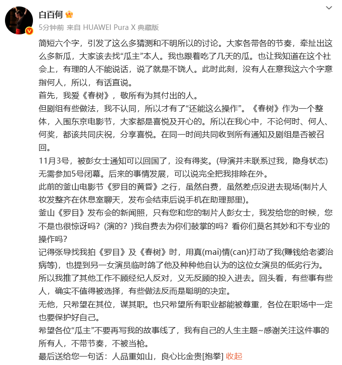 从白百何的角度看,支桌子的时候喊自己来,庆功宴的时候却把自己排除在外,这种情况换谁都会被气死吧?现在内娱舆论环境,很少人有明星愿意在网上发这种了,以白百何的业务能力和名气,她不需要这种炒作,这种事情的走向有很多不确定性,很可能带来不可预估的负面,我觉得她是真勇。 白百何回应