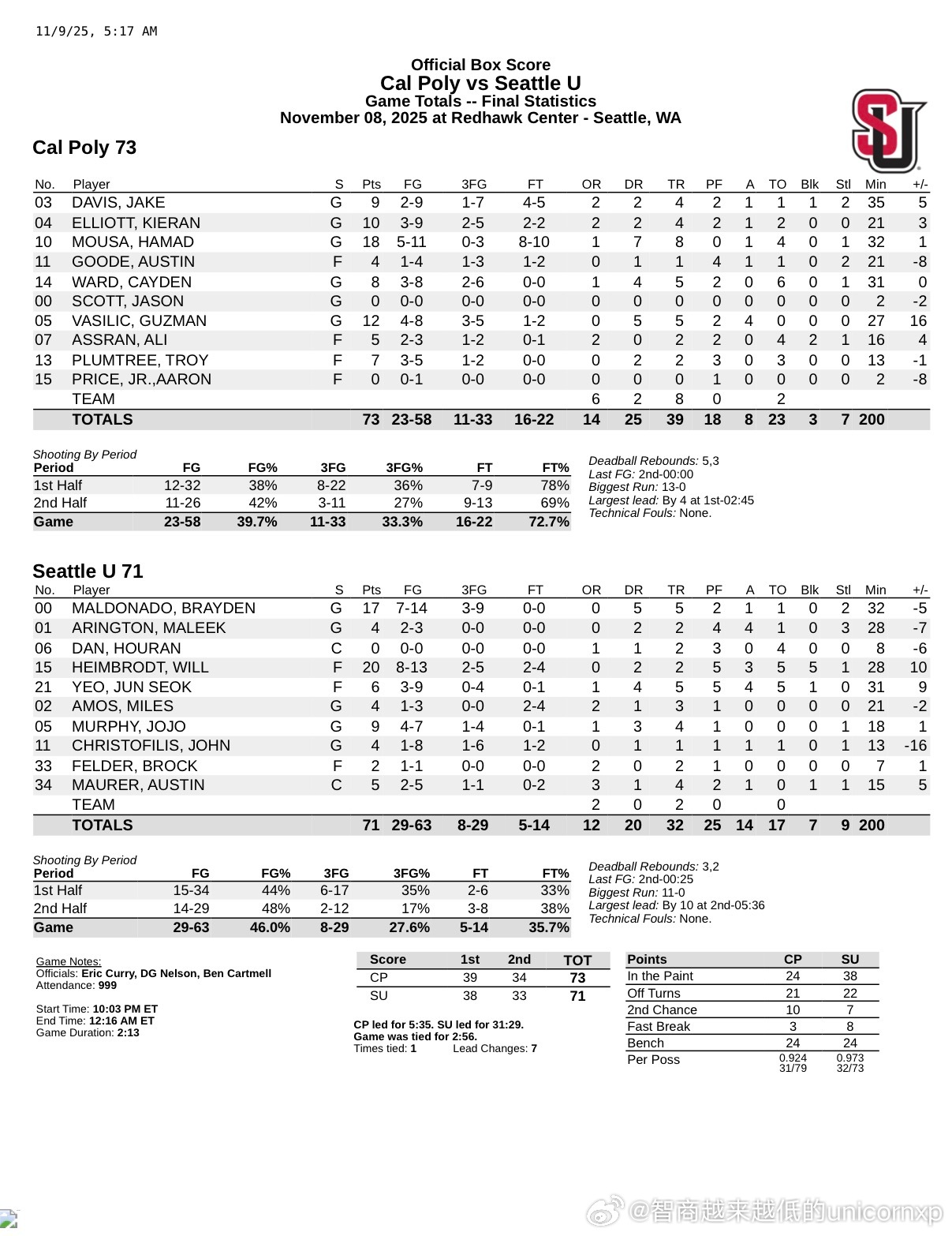 西雅图71比73遭加州州立理工逆转输球,淡厚然0分2板,吕俊锡6分5板4助,加州州立理工大学卡塔尔后卫Hamad Mousa(2006-203cm-SF/SG)得到18分8板ncaa亚洲球员ncaa中国球员NCAA[超话]