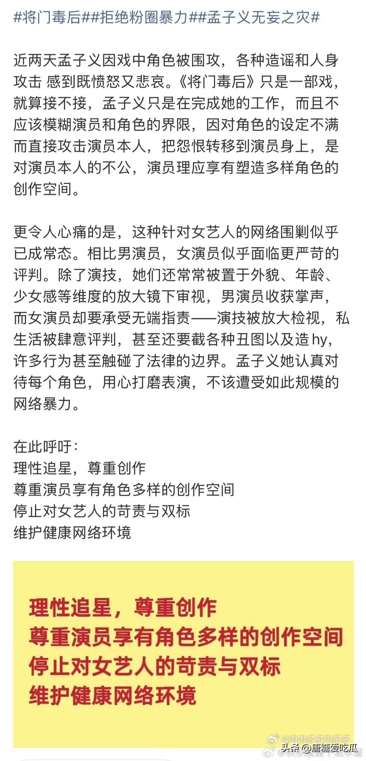 今天生气的不是何炅 也不是那英 而是孟子义,因为看着孟子义方呼吁粉丝理性追星的话,将门毒后她应该是已经接下来了。 之前说拒绝了,今天又定下来了,孟子义在这中间肯定是受委屈了的,孟子义不想接,但是公司安排她又拒绝不了。 王鹤棣粉丝还写论文分析她不适合,感觉孟子义现在有点像以前的杨紫,子义呀,那你就用实力让他们安静吧,生气是没用的。