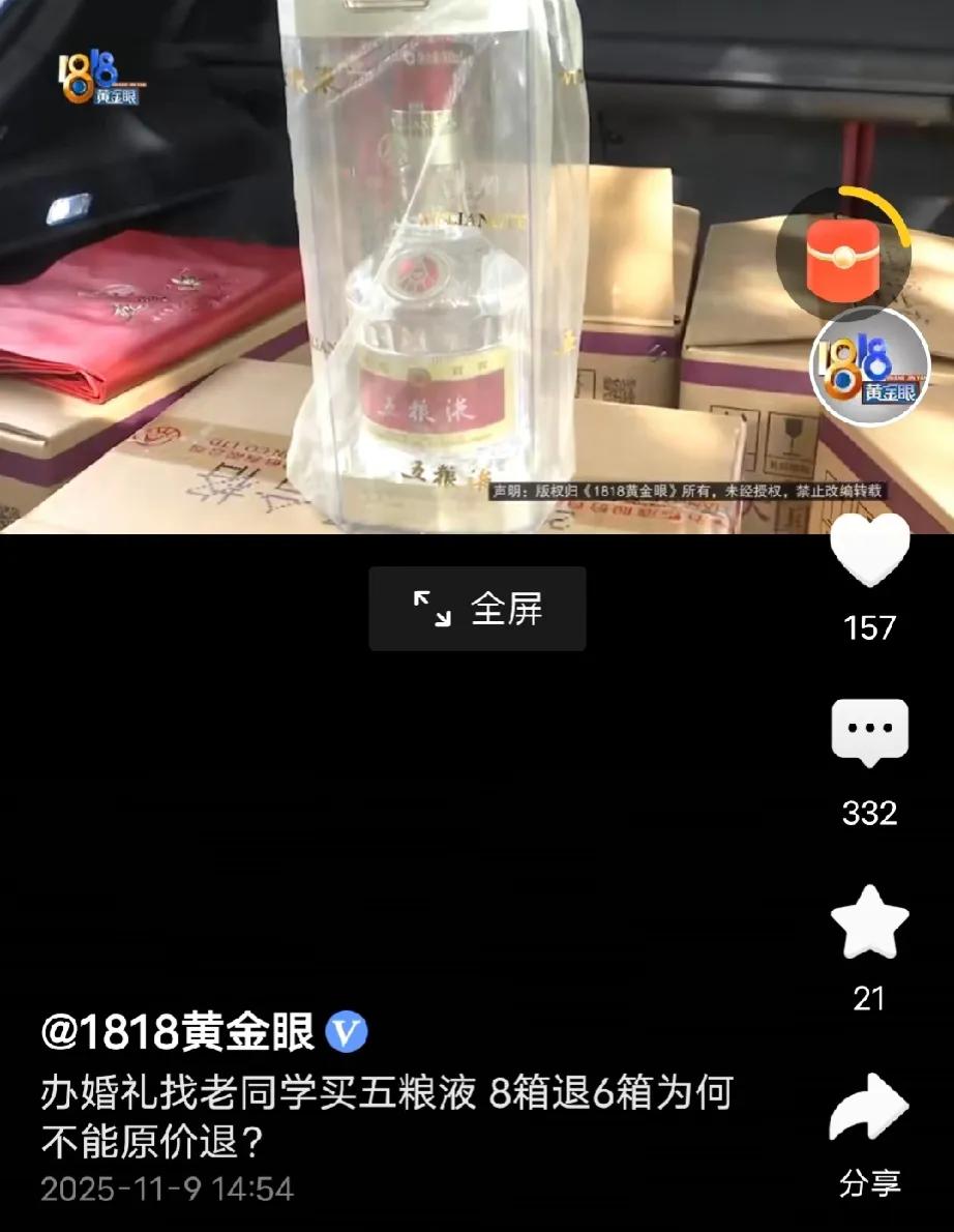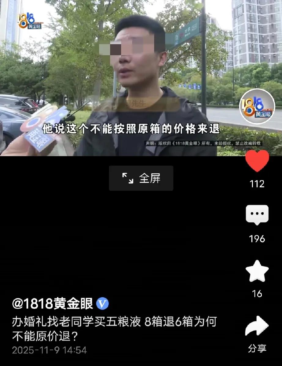 浙江杭州,男子办婚礼跟同学买8箱五粮液,一箱6瓶5400元一箱,两人约好喝不完可退,谁料,婚礼办完,只喝了2箱,男子要求原价退还剩余的6箱,同学不干了,说酒箱胶带撕开,影响二次销售,只能按750元一瓶收回,男子觉得被坑了,找来记者说了一番话后,同学秒怂,还答应所有酒按770元一瓶收回,没想到,男子还是不乐意,并扬言要起诉。网友热议:男子不地道,熟人的生意不能做。 杭州的周先生今年9月底办婚礼,为了招待好宾客,他打算买一批好酒。 周先生的高中同学郑先生是卖五粮液的,周先生联系了他,打算在他那买酒。 郑先生说,五粮液一箱6瓶,5400元一箱,最终,周先生跟郑先生买了8箱。 郑先生收到酒钱后,很快就安排人手把8箱五粮液送到周先生手里,两人口头约定,喝剩的酒按箱、按瓶都可以退回。 婚礼日期很快到了,让周先生没想到的是,他预定的五粮液还是多了,8箱酒虽然都拆封了,但只喝了11瓶,剩下37瓶,装在一起够6箱还多一瓶。 事后,周先生联系郑先生说,他的酒只喝了2箱,剩6箱,他想把6箱酒退了,郑先生问他酒的包装有没有拆开? 周先生谎称拆了4箱,有2箱是完全没拆封的。 郑先生回复说,他会跟总部反应,让周先生等几天。 可周先生等来等去,一直没等到郑先生的回复。 10月15号,周先生等不及了,就主动问郑先生,他跟上面反应得怎么样了? 郑先生回答他说,没拆封的那两箱按照770元一瓶收回去,已经拆封的就按750元一瓶收回。 周先生一听,不乐意了,要求按原价退回。 郑先生解释说,已经拆封的酒,影响二次销售,所以没法按原价收回。 周先生说,虽然外面的纸箱胶带拆开了,但是里面的酒瓶包装并没有拆,那些酒根本没动过。 但,郑先生不接受这个说法,之后还安排了验酒师到周先生家验酒。 后来,验酒师发现,其实周先生订的8箱五粮液,酒箱已经全部拆开了,并不像他说的有两箱是完好无损的。 周先生被当场拆穿,觉得很恼火,当场赶走了验酒师,中断验酒。 郑先生知道后,对周先生的所作所为很生气,他受不了周先生耍小聪明欺骗他,更让他气的是,验酒师没能验酒,就被赶跑,验酒师来回的车费都得他承担。 两人就这么僵持着,周先生气不过找媒体介入,他给记者看了他和郑先生的聊天记录,他说,两人约定喝不完的酒可以按箱、按瓶退回。 记者看到,虽然他们约定喝不完可以退,但是并没有说条件,也没有说按多少钱一瓶退。 记者联系郑先生,他说,酒的纸箱已经拆开,会影响二次销售,所以没办法按原价收回去。 周先生听完,当着记者的面不紧不慢地说,我的诉求很简单,按原价900一瓶退回,因为里面瓶子是未拆封的,另外我还要调查他的烟酒售卖资格。 郑先生听完,答应周先生说,全部按770一瓶退给他,不管拆不拆封,都全部收回。 但,周先生听了还是摇摇头,过了很久郑先生把他表姐的食品营业执照发过来,他表示烟酒也是食品类的。 周先生说,他考虑通过法律途径维权。 有人说,这个周先生也是做得不地道,你把纸箱拆了,还让人家按原价收回,熟人生意真是不好做,好同学最后变成仇家。 不过,也有人说,郑先生肯定是觉得自己理亏,后来才改变主意,两人各自心怀鬼 胎。 那么,从法律角度如何看待这件事呢? 周先生与郑先生口头约定“喝不完的酒可退”,但未明确退货条件及退款标准,属于违约责任约定不明。 《合同法》第111条规定,质量不符合约定的,应当按照当事人的约定承担违约责任。对违约责任没有约定或者约定不明确,依照本法第61条的规定仍不能确定的,受损害方根据标的性质以及损失的大小,可以合理选择要求对方承担修理、更换、重作、退货、减少价款或者报酬等违约责任。 周先生拆封酒箱但未损坏酒瓶包装,酒品本身无质量问题,郑先生以“影响二次销售”为由大幅压价退款,需举证证明纸箱拆封对商品价值造成的具体损失。 从公平原则出发,酒品核心价值未受影响,郑先生主张按750元/瓶回收缺乏充分依据,而周先生要求原价退货也未考虑拆封对商品流通的轻微影响,双方应就退款金额进一步协商,无法达成一致时可参照市场合理折价确定。 根据《烟草专卖法》第3条规定,国家对烟草专卖品的生产、销售、进出口依法实行专卖管理,并实行烟草专卖许可证制度。 郑先生从事酒类销售,虽酒类无需专卖许可,但若其同时涉及烟草销售或无食品经营许可从事酒类零售,可能违反市场监管规定。 郑先生仅提供表姐的食品营业执照,未证明自身具备酒类经营资质,若其属于无证经营,双方买卖合同虽未必无效,但郑先生可能面临行政处罚。 周先生以“调查售卖资格”为由施压后,郑先生迅速让步调整退款价格,侧面反映其可能存在资质瑕疵,若周先生起诉,可要求核查郑先生经营资质,若确认无证经营,可依据《合同法》第58条主张返还价款并要求合理赔偿。 关注@猫眼学法 品读案例故事,学习法律经验