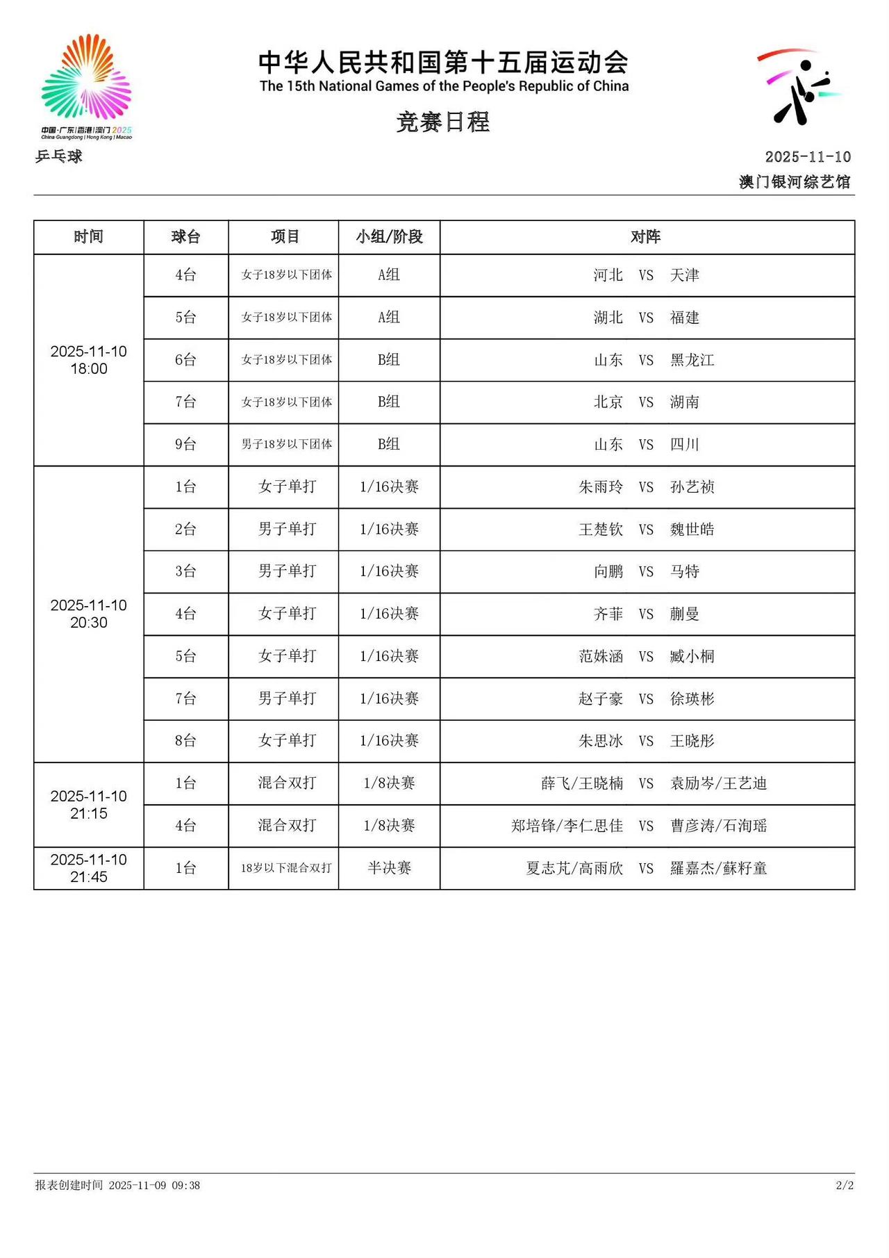 孙颖莎,樊振东晋级16强,首轮获胜,王楚钦的比赛在晚上进行。 11.10日,全运会单打1/16决赛,中午时段的比赛已经结束。 孙颖莎(河北队)4-0刘炜珊(天津队)【11-4,11-4,11-9,11-9】 这个二号台的转播画质,真的是尽力了, 真的是差一点就看清莎莎了。 并且声音非常小, 还好咪咕安排了解说,要不然按照昨天的情况, 二号台就是没声音的。 莎莎4-0炜珊,说实话,实力还是有差距的, 不管是速度,还是落点,战术, 莎莎要明显更厚实, 炜珊也尽力了,只能说碰上了莎莎, 那真的没办法了。 樊振东(上海地产集团队)4-0周雨(河北队)【12-10,11-6,11-8,11-6】 只能说周雨的签位有挑战, 实力上也确实是樊振东更厚, 第一局,周雨追到10平,樊振东的关键分把握的非常好。 小胖打完比赛,衣服都湿了, 出了很多汗。 陈熠(上海地产集团队)4-0杨诗璐(广东队)【11-8,11-8,11-4,11-3】 陈熠赛后采访的时候说, 虽然是4-0,但是非常不好打,整场都不轻松。 这一段时间磨练的,也确实是谦虚了很多。 心踏实下来了,就开始进步了。 陈俊菘(福建队)4-0徐晨皓(北京八喜队)【11-5,11-3,11-3,11-7】 陈幸同(辽宁队)4-1马小惠(上海地产集团队)【11-3,11-6,11-4,7-11,12-10】 孙正(浙江队)4-1徐海东(辽宁队)【5-11,11-9,11-7,11-7,11-8】 高杨(天津队)4-1陈垣宇(江苏挺拔队)【11-9,11-2,7-11,11-5,11-7】 徐海东和陈垣宇首轮被淘汰了, 截止到目前,国际赛场上比较熟悉的, 周启豪,石洵瑶,陈垣宇都被淘汰。 晚上20:30,还有七场单打比赛要进行, 其中王楚钦vs魏世皓,在二号台,加油, 向鹏,蒯曼,徐瑛斌,王晓彤,朱雨玲等也会出场。 加油加油!