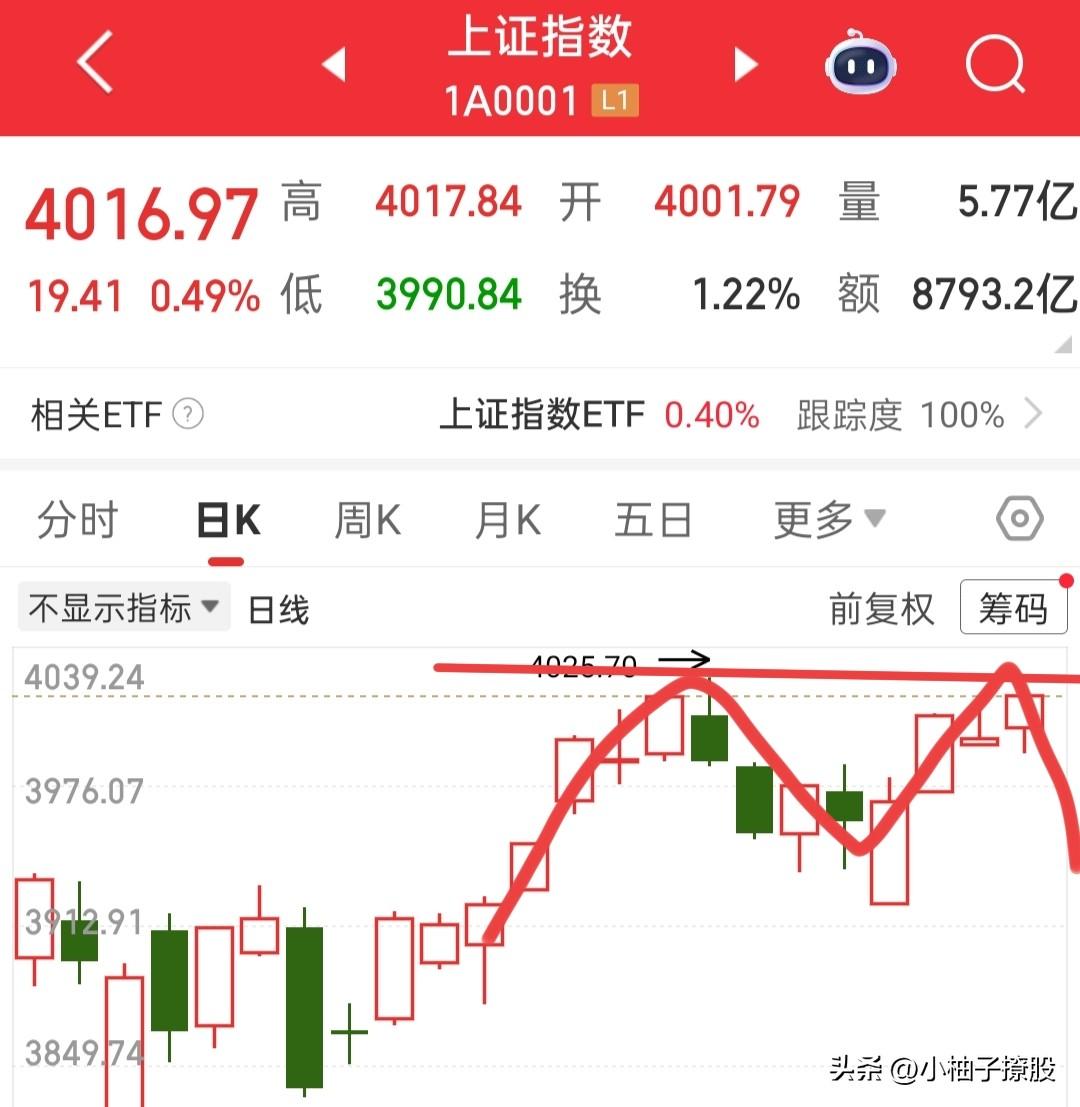 好了,快收盘了,接下来怎么看? 今天下午大盘选择向上变盘,打算去创新高的,不管能不能突破4025.7点,今天我认为减一些都不为过! 仓位轻一些,对接下来回调就会有更灵活的对应,我们暂且先认为大盘要走M顶,因为前方已经形成三个了 也就是回调下来,再去拉升,突破左侧高点! 不要贪!