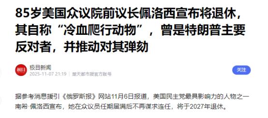 85岁的佩洛西终于走了!当地时间11月6日,包括美国《华盛顿邮报》在内的多家媒体披露,美国众议院前议长佩洛西已经对外宣布,她将在本届国会任期结束后彻底退休,不再竞选下一届国会议员。 85岁的美国众议院前议长佩洛西官宣将在本届国会任期结束后彻底退休,不再竞选连任,结束近40年的国会生涯。 消息一出,特朗普第一时间在白宫新闻发布会上抛出尖锐评价,直言这位老对手的退场是“国家之幸”。 并且当着记者的面称佩洛西是“邪恶的女人”,还强调她的退休给国家卸下了巨大负担,指责她任职期间给美国造成了严重的损失和声誉损害。这番评价算不上意外,两人的积怨早已经是公开的秘密。 佩洛西和特朗普的冲突贯穿了后者的总统任期,2019年,双方因为政府从叙利亚撤军的问题在白宫会议室爆发激烈争执。 佩洛西站起身用手指着特朗普对峙,那张照片后来被特朗普公开,佩洛西却毫不在意,反而把它置顶在自己的社交媒体主页。 2020年国情咨文现场更夸张,佩洛西在特朗普演讲结束后,当着全场的面直接撕毁了手中的演讲稿,那一幕成了美国政坛极具戏剧性的画面。 而最激烈的交锋当属两次弹劾,2019年,佩洛西主导众议院以“滥用职权”为由弹劾特朗普。2021年1月6日国会山骚乱事件后,她再次推动弹劾程序。 但这两次努力最终都以失败告终,反而让两人的对立更加尖锐。佩洛西最近接受采访时还在骂特朗普“卑鄙”,说他是“地球上最糟糕的人”,指责他不尊重宪法。 其实佩洛西的退休算不上“功成身退”,更像是被内外压力逼到了墙角。她的政治生涯转折点出现在2021年的国会山骚乱。 那天,她被困在国会大厦内狼狈求援,办公室被骚乱者洗劫一空,名字甚至被列入了骚乱分子的“处决名单”。 这段经历成了她绕不开的阴影,前段时间有记者追问骚乱责任时,她当场情绪失控,指着记者大喊“闭嘴”,激动到几乎站不稳,得靠助手搀扶才能站稳。 而民主党内部的不满也在加速她的退场,拜登中途退出竞选时,佩洛西力挺哈里斯上位,这个决定直接得罪了拜登家族。 更要命的是哈里斯在2024年大选中惨败给特朗普,让民主党在关键摇摆州输得一塌糊涂,佩洛西因此成了党内矛盾的替罪羊。加上民主党内部早就有换血的呼声,不少活动人士都在呼吁资深议员退居二线,给年轻一代领导者让路。 这位美国历史上首位女性众议院议长,职业生涯其实有过不少高光时刻。她1987年当选众议员,2007年首次出任议长,前后两次执掌众议院权杖,经历了里根、老布什到拜登等多位总统的更迭。 她推动通过了2010年《平价医疗法案》、2022年《通胀削减法案》等重要法案,前议长纽特·金里奇都称她是“历史上最强硬的议长”。她在共和党掌控国会时,还能靠组织能力维持民主党团结,常用阻止对手进入重要委员会的方式施压。 但争议也一直围绕着她,2019年,她和特朗普的对峙导致政府停摆35天,直接造成了110亿美元的经济损失。她的丈夫保罗·佩洛西更被外界质疑利用她掌握的内部信息牟利。芯片法案通过前,保罗大量购入英伟达股票,后来股价暴涨,赚得盆满钵满,这事儿让佩洛西“国会山股神”的名号传开,也引来了不少批评。 从1987年进入国会到2027年任期结束,佩洛西的国会生涯刚好满40年。她风光过,也狼狈过,搅动了美国政坛几十年。如今选择退场,有人惋惜有人叫好,但无论如何,一个政治时代算是彻底翻篇了。 来源:极目新闻