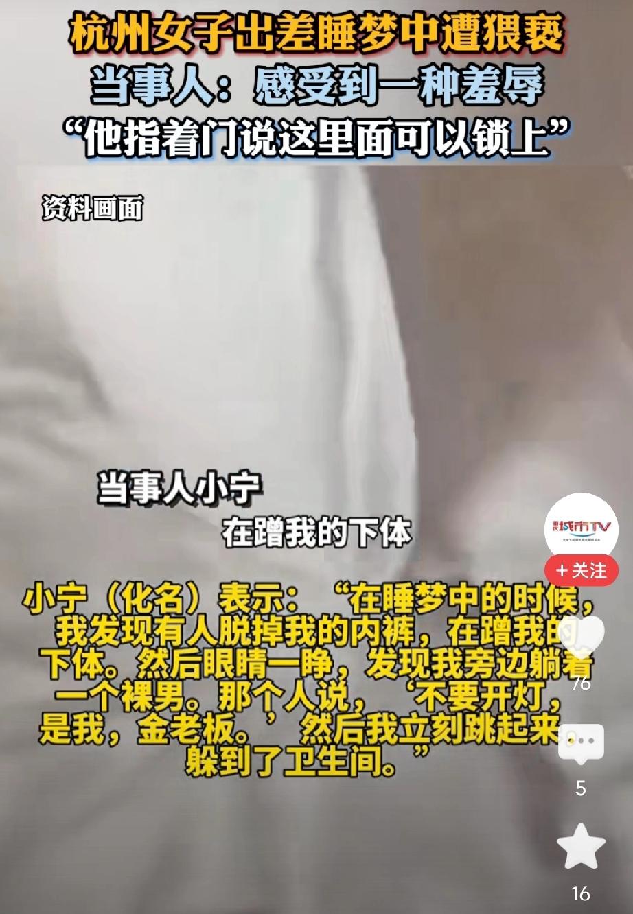 2025年,杭州一女子出差住酒店,半夜被子突然遭掀开,她惊醒后发现身旁,竟然躺着一个陌生男人,对方见女子醒了,急忙说,不要开灯,是我,金老板。   女生吓得躲到了卫生间,没想到,男子随后的举动更过分。   小宁盯着诊断书 “创伤后应激障碍” 的字样,指尖划过工伤认定决定书 —— 这个杭州姑娘的维权路,藏着太多不为人知的坚持。   2025 年 1 月 13 日晚,她跟着客户入住合作酒店,奔波一天的疲惫让她倒头就睡,没留意房门未完全锁死。   凌晨两点,被子被轻轻掀开的触感惊醒了她,黑暗中陌生男人的气息扑面而来,内裤已被褪到腿弯。   “别开灯,是我,金老板。” 合作方负责人的声音响起,小宁浑身血液几乎凝固,猛地裹紧被子冲向卫生间。   反锁房门的瞬间,她才敢大口喘气,心脏撞得肋骨生疼,颤抖着摸出手机报警,指尖连号码都输不利索。   门外传来金老板的抱怨:“怎么这么大惊小怪?酒店房门都不锁好,出事怪谁?” 没有半分愧疚。   警察赶到时,金老板仍在房间里,声称 “走错房间”,却拿不出自己的房卡,眼神躲闪不敢对视。   调取监控发现,他一小时前曾在前台徘徊,结合其长期客户身份,警方推测他通过漏洞获取了备用房卡。   涉事酒店负责人支支吾吾,承认 “偶尔为熟客简化登记流程”,但拒不承认违规发放房卡,态度敷衍。   小宁当天就换了酒店,夜里反复惊醒,一闭眼就是黑暗中那张陌生的脸,根本无法正常工作。   1 月 15 日,她去医院检查,医生诊断为急性应激反应,建议心理干预,可她还得处理未完成的工作交接。   律师看完材料明确:金老板的行为已构成强制猥亵罪,《刑法》第二百三十七条有明确量刑规定,最低可判拘役。   很快,警方以涉嫌强制猥亵罪对金老板刑事拘留,合作方第一时间发布声明,终止与其所有合作。   处理工作时,小宁偶然看到 2024 年崔丽丽案的报道 —— 崔丽丽出差遭性侵后被认定工伤,这让她心里一动。   3 月 10 日,小宁正式向人社局提交工伤认定申请,附上医院诊断证明和警方立案回执,却被朋友劝 “别折腾”。   “崔丽丽用了一年多才认定,你何必自找麻烦?” 可她想起金老板的嚣张,咬牙坚持:“我要讨个说法。”   4 月 22 日,人社局组织专家会诊,结合她的就诊记录,确认创伤后应激障碍与侵害事件直接相关,符合认定条件。   期间酒店提出和解,愿意赔偿 5 万元私了,前提是她撤回对酒店的投诉,被小宁当场拒绝:“安全漏洞必须整改。”   很快,监管部门对涉事酒店下达整改通知,责令公示房卡管理制度,安装访客人脸识别系统,限期一个月完成。   7 月 3 日,人社局公示工伤认定结果,依据《工伤保险条例》第十四条第五项 “因工外出受伤”,正式认定为工伤。   消息传出,金老板的辩护律师提出异议,却拿不出任何有效证据,案件很快进入审查起诉阶段。   9 月 10 日,小宁收到酒店的书面道歉和 3 万元精神损害赔偿金,整改后的酒店还邀请她参与安全监督。   如今小宁换了份不需要出差的工作,每周坚持去做心理疏导,状态比之前好了很多,脸上重新有了笑容。   她把工伤认定决定书和崔丽丽案的报道放在一起,偶尔会给崔丽丽发消息,互相分享近况和维权心得。   闲暇时,她会在社交平台分享女性安全小贴士,从酒店反锁技巧到维权流程,每条都配着自己的真实经历。   越来越多职场女性给她留言道谢,说她的故事给了自己勇气,遇到不公也敢站出来维权,不再默默忍受。   涉事酒店整改后再没出过安全问题,成了当地酒店安全示范单位,这是小宁没想到的意外收获。   她知道自己的坚持没白费,这份工伤认定不只是个人的正义,更是给所有职场女性的一份安全底气。     信源:深圳新闻网 11月8日 杭州女子出差睡梦中遭裸男猥亵