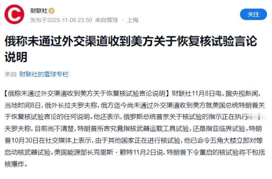11月8日,俄罗斯卫通社报道,俄罗斯外长拉夫罗夫表示,俄罗斯尚未通过外交渠道获得美国总统唐纳德·特朗普关于“恢复核试验”言论的具体意图解释。   他指出,“目前,我们尚未收到任何外交层面的解释,不清楚特朗普总统提及恢复核试验时究竟意指何为。”   拉夫罗夫这话可不是随便说的,俄方是真的摸不着头脑了。特朗普这已经不是第一次提这事儿了,算上11月2号接受哥伦比亚广播公司采访那次,一周里他已经把“恢复核试验”这话念叨了三遍。   最早是10月30号,他在自己的社交平台上发文,说已经命令五角大楼立刻启动核武器测试,理由是“其他国家在搞相关测试”。   可问题跟着就来了,特朗普自己说得挺坚决,美国能源部长赖特却出来拆台。赖特11月2号明确表示,总统说的核试验不包括实际核爆炸,就是“系统测试”或者叫“亚临界试验”,测的是核武器除爆炸外的其他环节。这两种说法差得太远了,换谁都得犯嘀咕。   而且俄方早就主动去问过了,俄对外情报局局长纳雷什金在安全会议上透露,俄驻美外交机构已经联系了美国国家安全委员会和国务院,专门要说法。结果美方那边没给任何实质性答复,就这么晾着俄方。拉夫罗夫当然得站出来说话,毕竟核试验这事儿太重大,根本不能含糊。   俄罗斯总统普京已经有了动作,他5号召集了联邦安全会议,几乎整个国家领导层都凑到了克里姆林宫,原本要谈运输安全,硬是先开了场关于核试验的紧急讨论。   普京没直接下令准备核试验,只要求外交部、国防部这些部门一起研判,提交准备工作的建议方案。他的态度很明确,俄罗斯会守着《全面禁止核试验条约》,但别人要是先试,俄方肯定对等回应。   俄防长别洛乌索夫在会上说得更直接,他认为该立刻准备全面核试验,北冰洋的新地岛试验场早就准备好了。俄武装力量总参谋长格拉西莫夫也急了,他觉得美方再回避解释没用,俄方要是不及时准备,真出事就来不及了。   显然美国国内其实也乱成一团,被特朗普提名的战略司令部司令人选理查德·科雷尔,在国会听证会上被问起这事时,直接说自己没法解读总统的话,因为中俄根本没在搞核爆炸试验。   民调数据更直观,46%的美国民众反对恢复核试验,只有34%的人支持。内华达州的民主党议员泰特斯骂得最狠,说特朗普把个人野心放在民众安全之上,毕竟内华达州有美国重要的核试验场,当地人最怕辐射问题。   更讽刺的是特朗普自己的说法都在变,5号那天,网上流出一段疑似AI生成的视频,他在里面还重申要重启核试验。可没过多久,他在迈阿密的商业论坛上又改口,说美俄中可能一起搞无核化计划。这种反复无常的表态,让俄方更难判断真实意图。   拉夫罗夫要的其实就是句准话。是像特朗普说的搞核爆炸试验,还是如赖特解释的只做亚临界测试?美方给个明确答复,俄方才能决定下一步怎么走。毕竟核问题牵一发而动全身,万一误判了形势,后果谁都承担不起。现在美方一直不吭声,俄方只能一边等解释,一边做着最坏的打算。