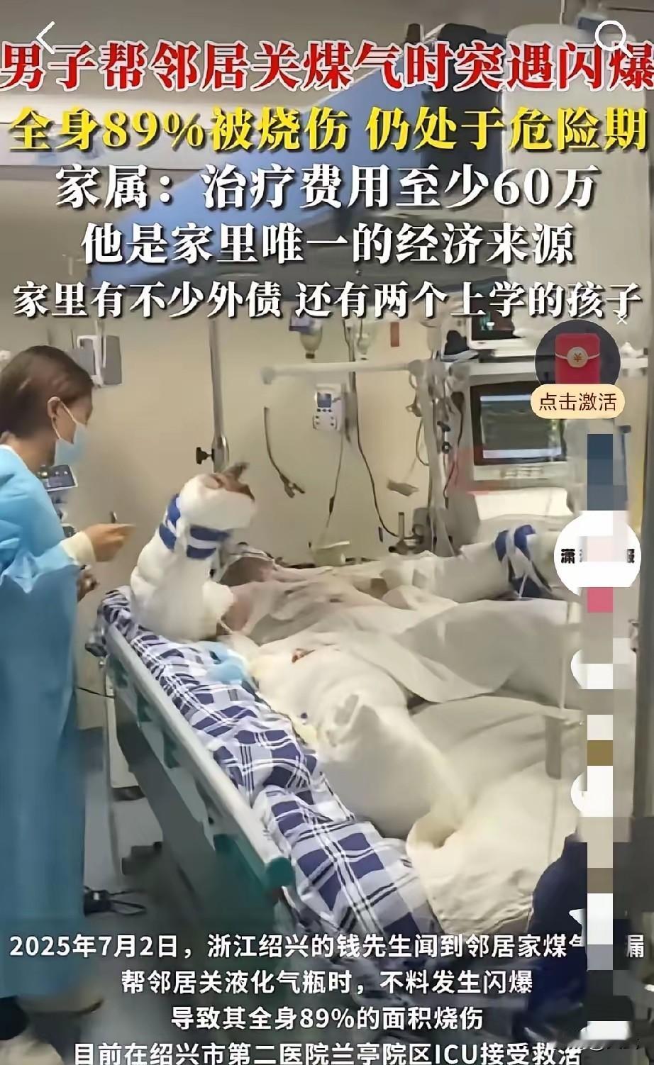 浙江绍兴,钱先生和妻子带着两个孩子,过着虽不富裕却温馨的日子。一天,他们在家中闻到浓烈的燃气味,钱先生出于好心,便前往邻居家帮忙关闭阀门。 可谁也没想到,液化气瓶突然爆炸,巨大的冲击力瞬间将钱先生掀翻,熊熊火焰将他吞噬。钱先生的衣服裤子全部被烧没,身体也被烧得惨白,全身89%烧伤,气管血管破裂,生命垂危。 在接下来的4个月里,钱先生经历了无数次痛苦的救治,但最终还是离开了人世。这期间,医疗费花了140多万,家里还欠下了近五六十万的外债。 钱先生的妻子独自承受着巨大的悲痛,还有两个年幼的孩子,听到爸爸的死讯后,号啕大哭。然而,更让人心寒的是,邻居在这场事故中,始终没有表现出任何关心和表态。 钱先生的好心换来了这场悲剧,让一个家庭陷入了绝境。而邻居的冷漠,更是让这份伤痛雪上加霜。这起事件,值得我们深思,在见义勇为的同时,如何保障好心人的权益,以及如何让社会多一些温暖与责任。
