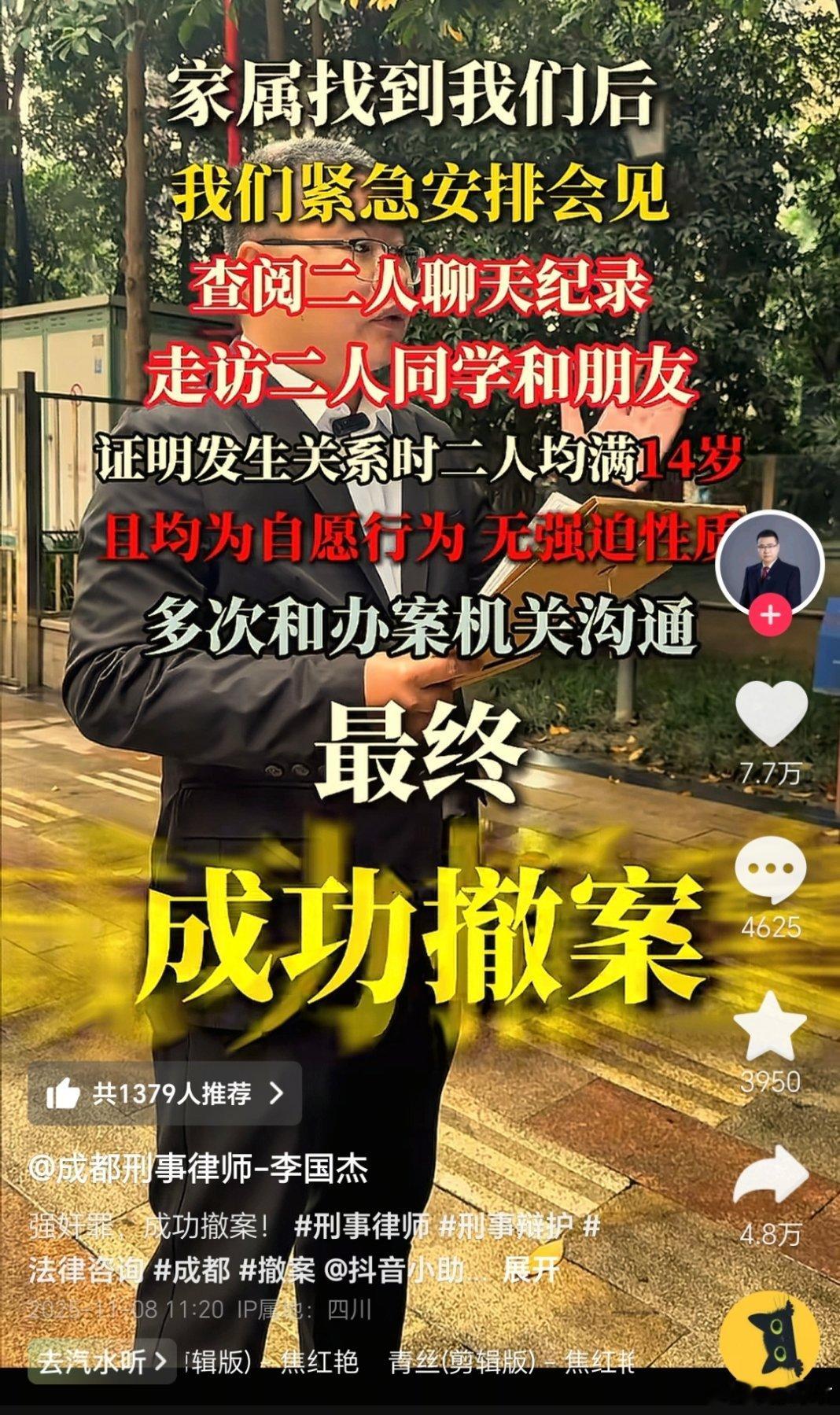 律师介入后,通过查阅两人聊天记录,以及走访两人同学和朋友,证明两人发生关系时均已年满14周岁,且为自愿发生关系。