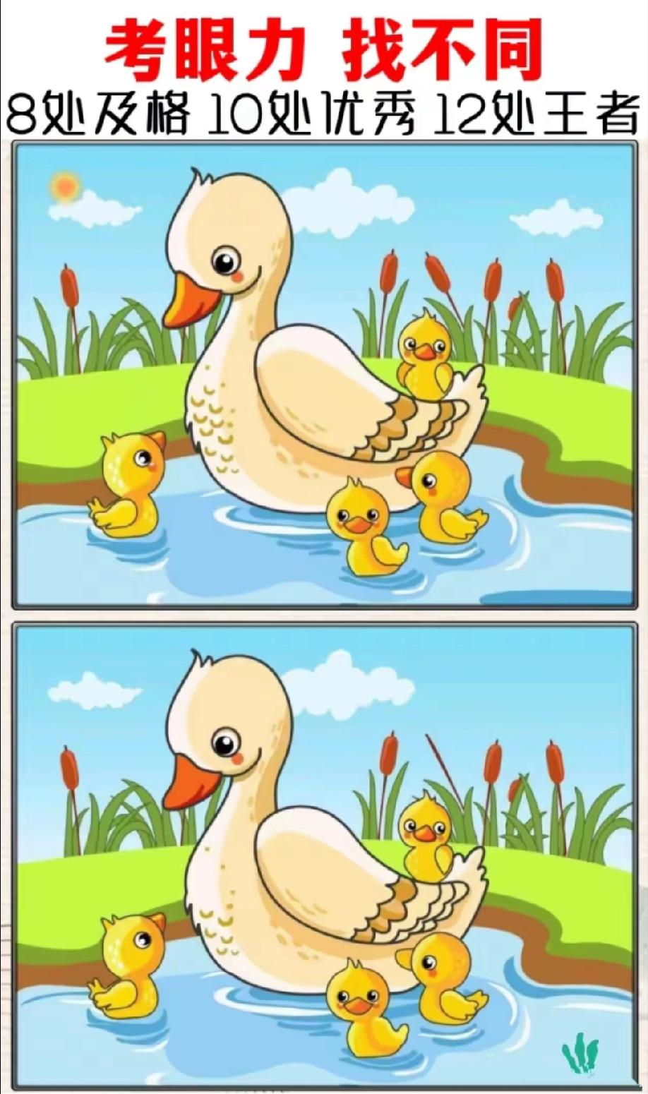 绝了!这鸭妈妈和小鸭的图藏了多少差异?我眼睛都看花了才找到4处,你现在找出几个了?